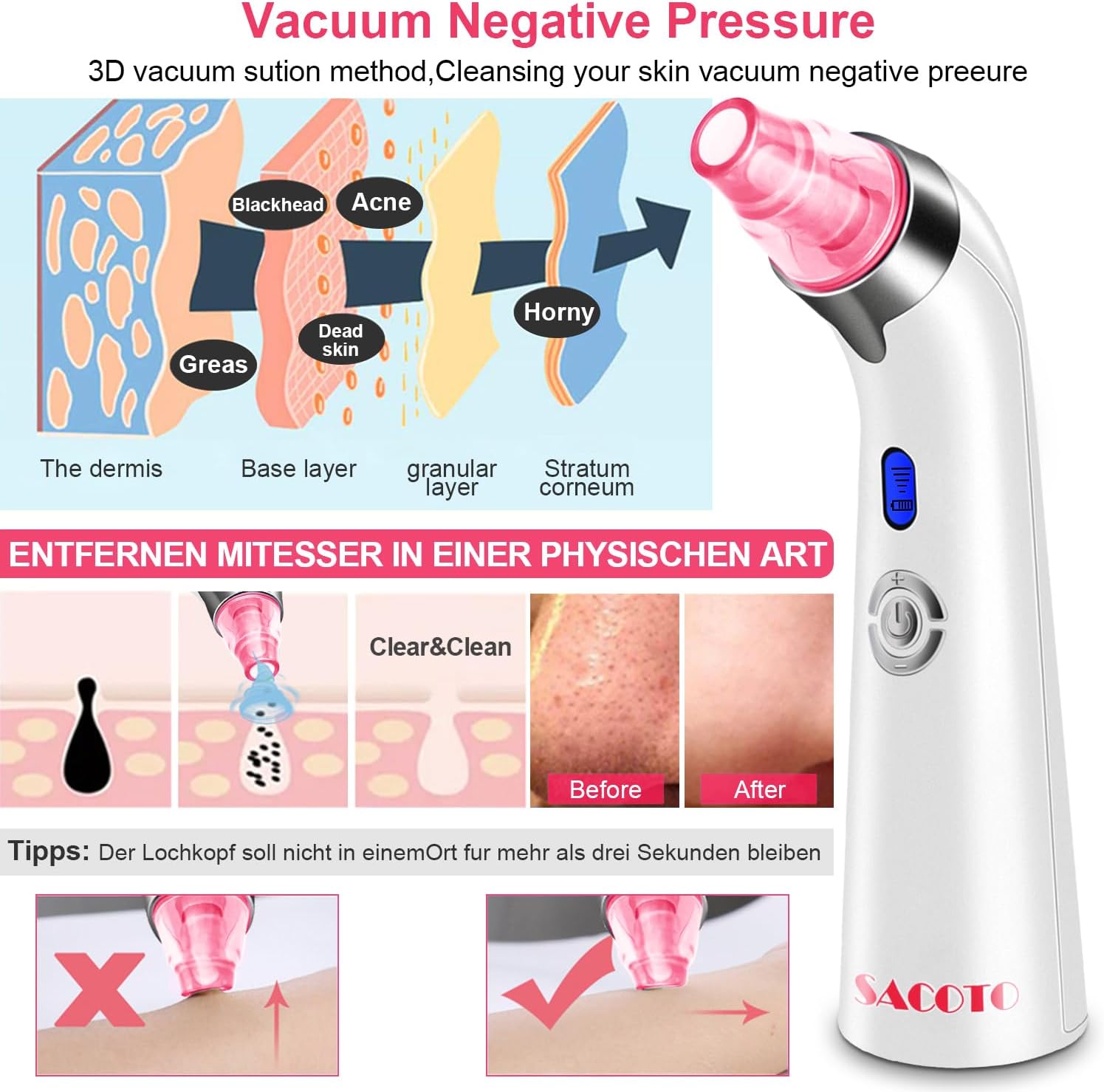 - Blackhead Remover: Powerful blackhead Remover tool can be safely used on the face directly achieve deep cleaning and effectively remove blackheads