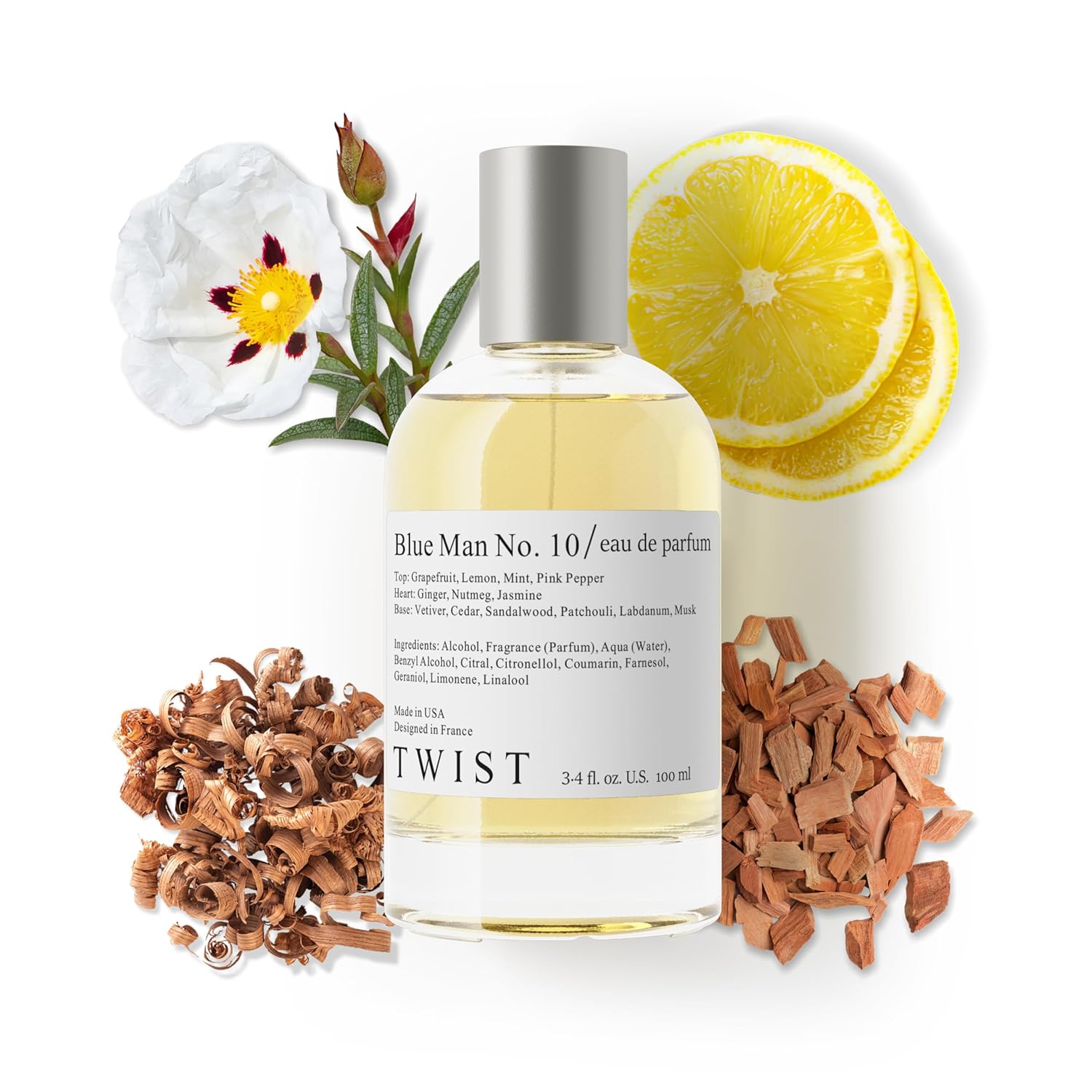 - CONCENTRATED FRAGRANCE BLUE MAN NO. 10: A woody aromatic men's perfume with refreshing top notes of grapefruit, lemon, mint, and pink pepper; heart notes of ginger, nutmeg, and jasmine; and base notes of vetiver, cedar, sandalwood, patchouli, labdanum, and musk. This fragrance is a perfect blend of freshness and warmth, making it an ideal choice for modern men.