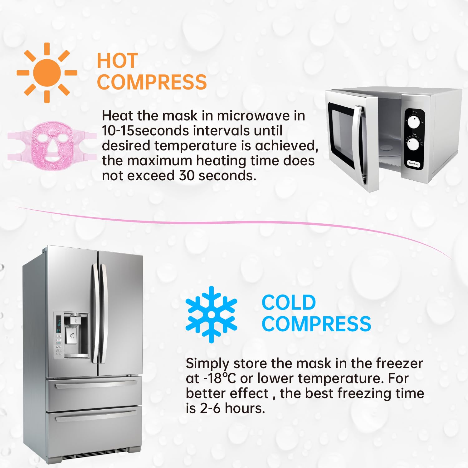 - 【CONVENIENT TO USE】simply store the mask in the freezer at -18℃ or lower temperature for at least 2 hours.Heat the mask in microwave in 10-15seconds intervals until desired temperature is achieved,the maximum heating time does not exceed 30 seconds.