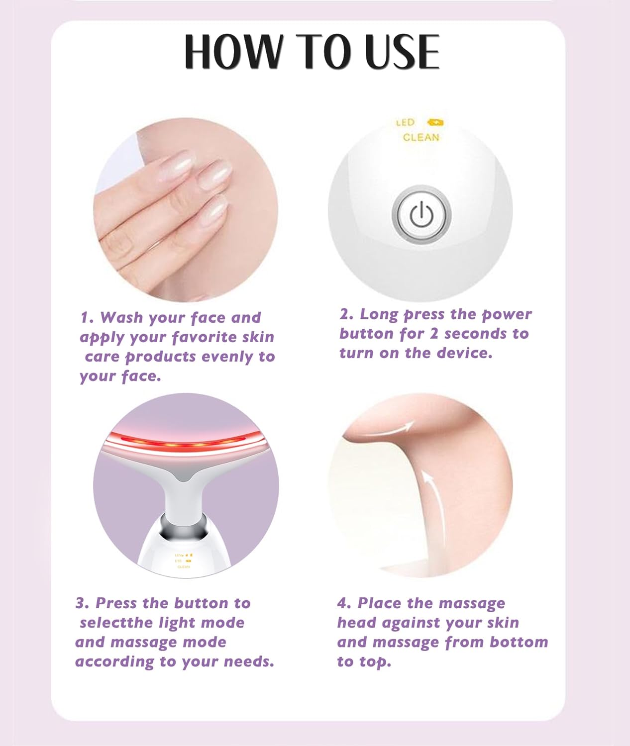 - [3 MASSAGE MODES FACE NECK MASSAGER] The CLEAN Mode can clear the pores and keep your skin clean and glow; The second Mode can relax your skin, and help your skin absorb skin care products; The HOT Mode can soothe your skin with heat and and rejuvenate your skin.