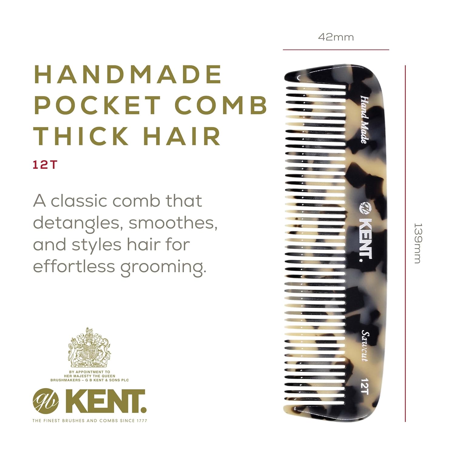 Kent 12T TW Wide Tooth Detangling Comb - Handmade Large Pocket Comb for Thick, Curly, and Wavy Hair Grooming - Saw-Cut Beard and Mustache Comb