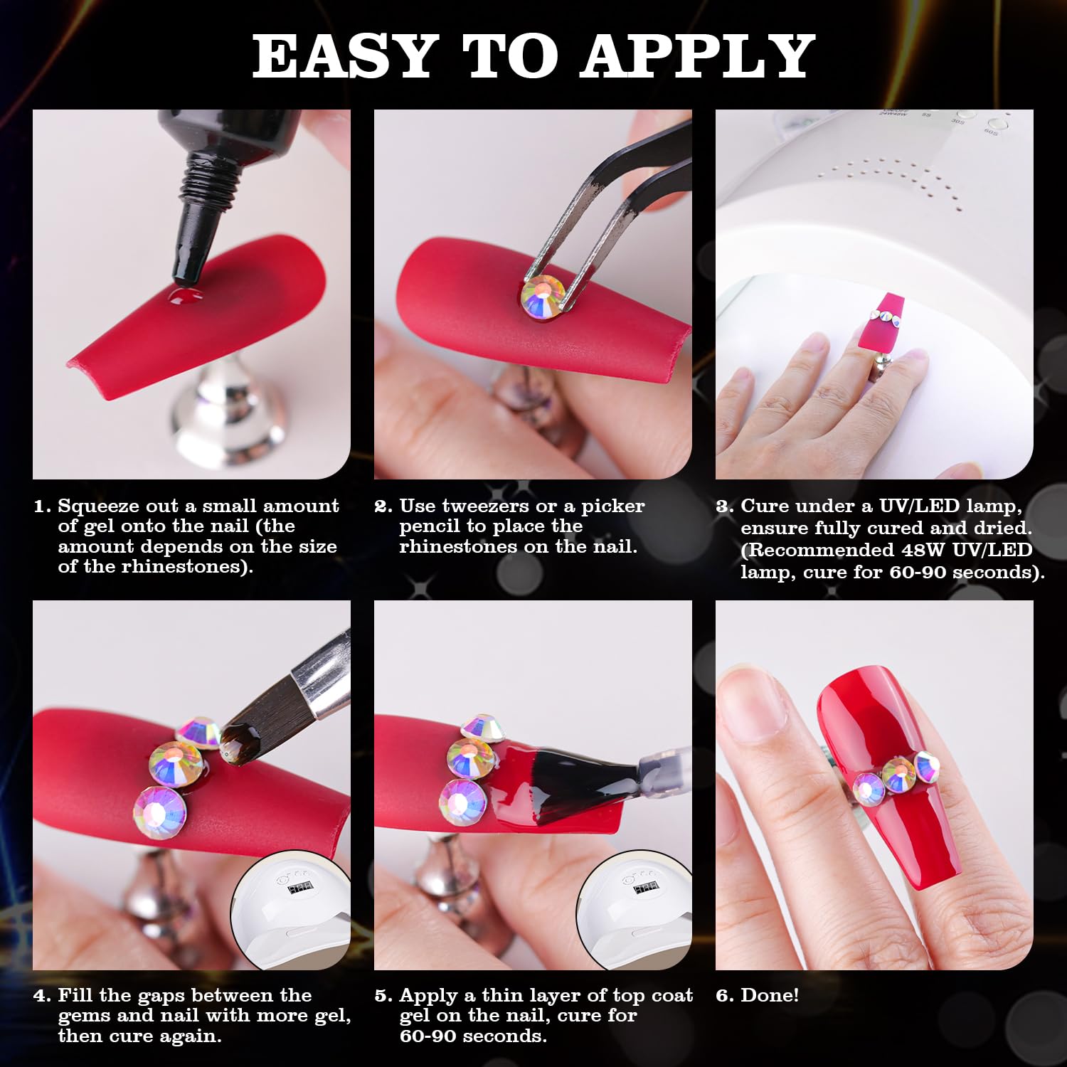 - 💎ADHESIVE GEL GLUE -- The crystal clear nail gem glue uses a special, non-toxic and eco-friendly formula with strong tackiness, adhesion, and fluidity for easily applying decorations. It is a type of UV gel glue. After proper curing under a UV/LED lamp, the glue dries clear with superior bonding strength that can last weeks without falling off. With the designed tip, you can easily and conveniently apply the glue to the nail bed or the surface of false nails.