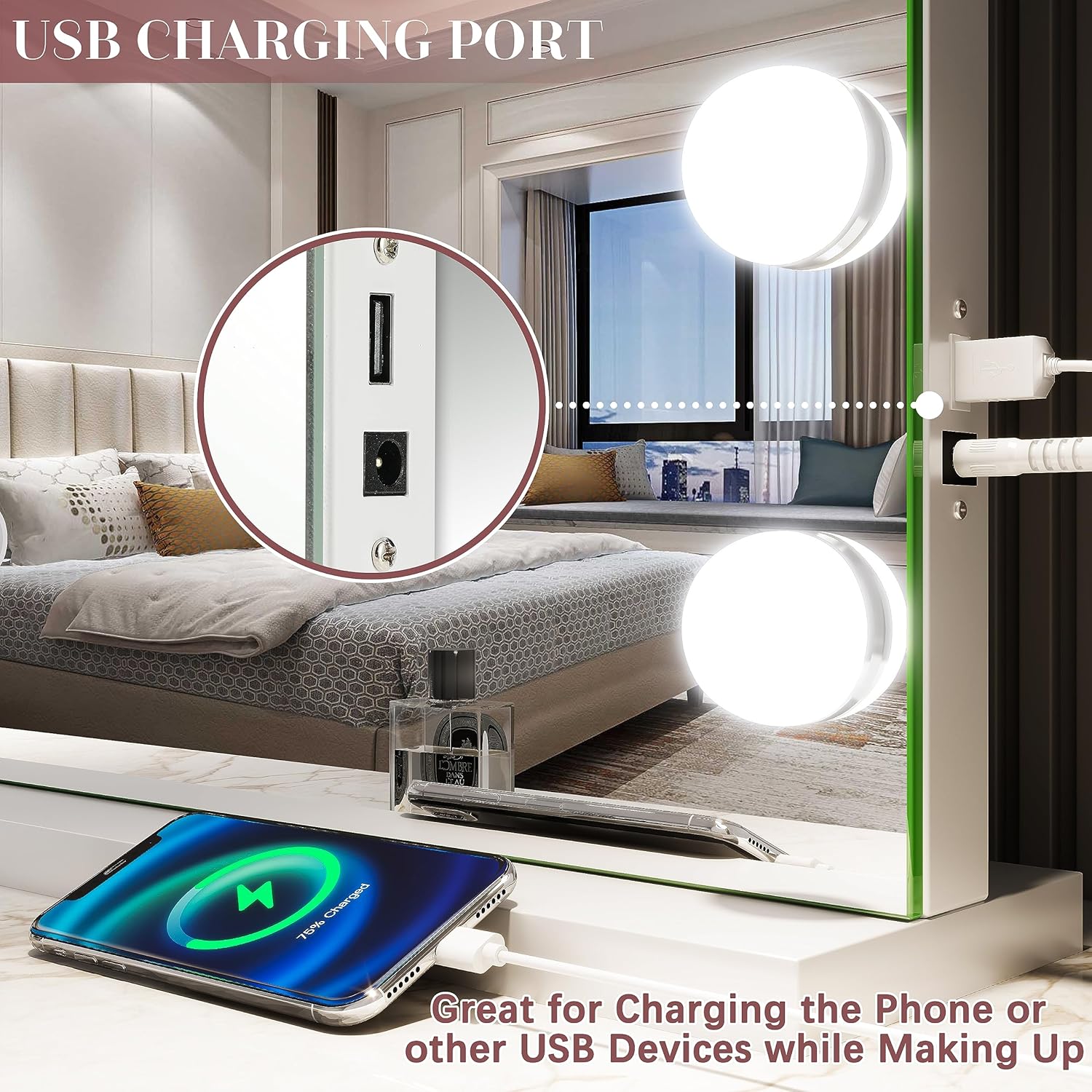 32"x24" Hollywood Vanity Mirror with Lights, 18 Dimmable LED Bulbs, 3 Color Modes, 10X Magnification, USB Charging Port, Tabletop or Wall-Mounted