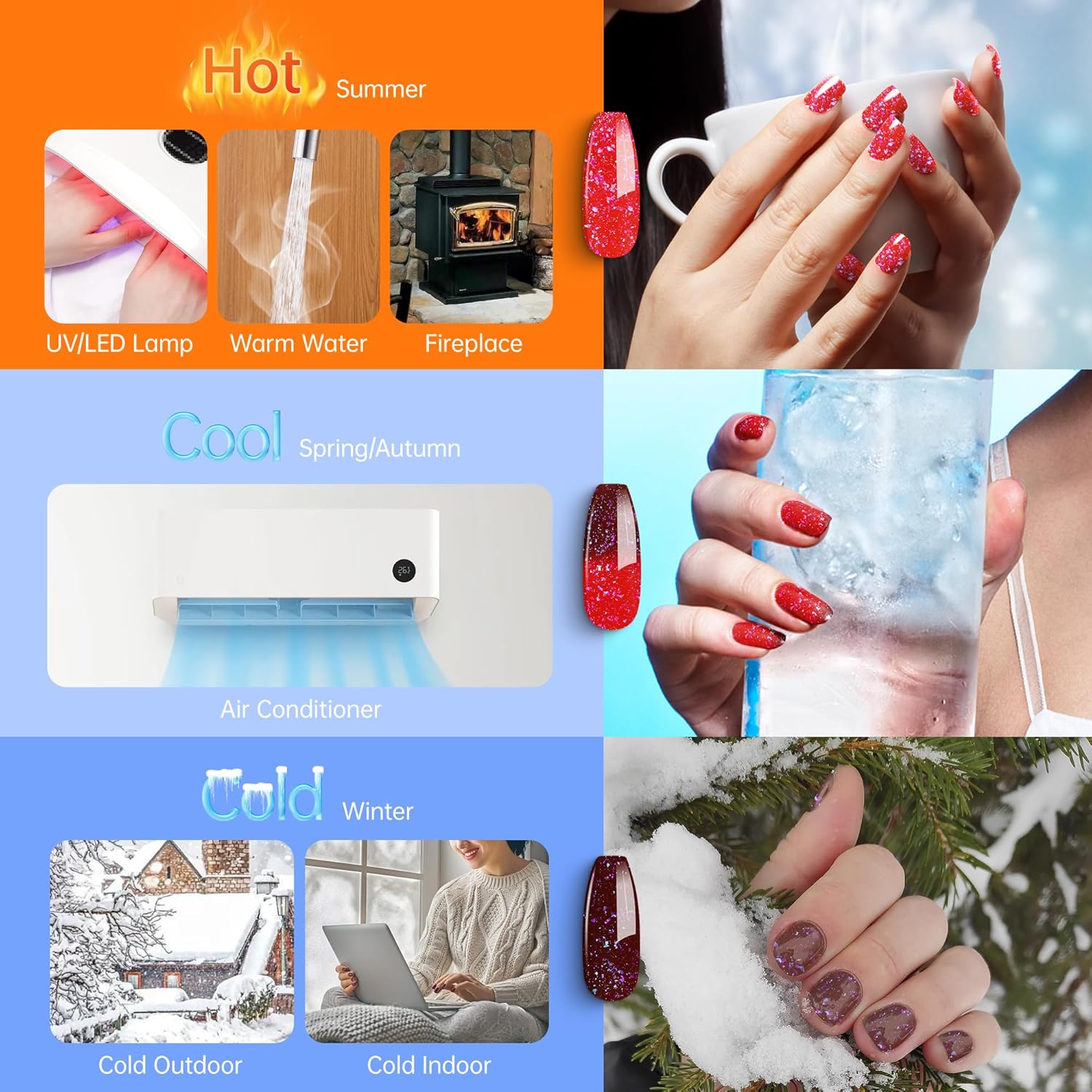 - Color-changing Brocade Glitter Gel :The gel changes color when the temperature exceeds 31°C or falls below 21°C, darkening as it cools and lightening as it warms. The colorful glittery brocade glitter in the gel creates a dazzling and radiant nail look.