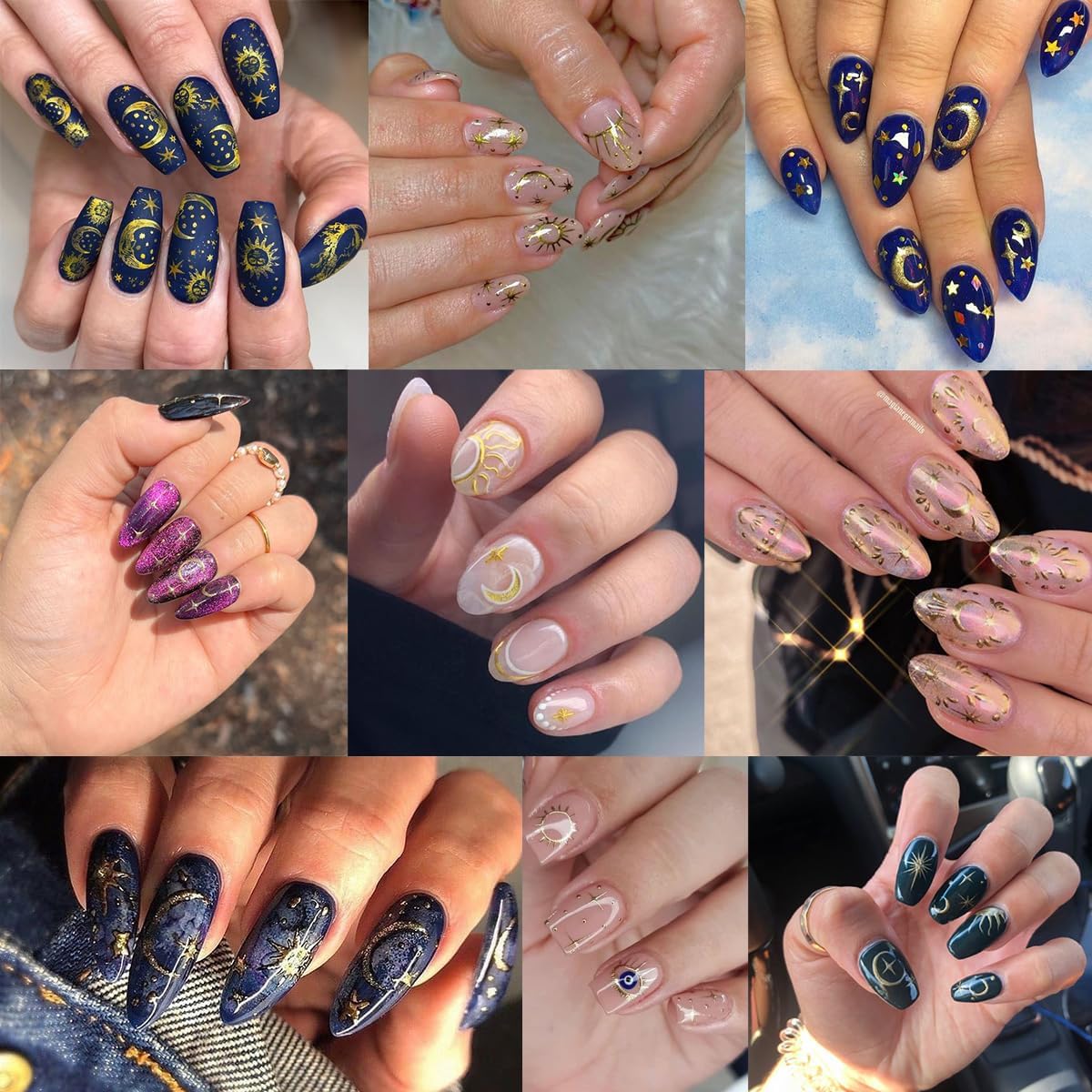 8 Sheets Metallic Sun Star Moon Nail Art Stickers 3D Self-Adhesive Gold Decals Sun God Asterisk Snake Eyes Design for Women Acrylic Nails DIY Decoration Supplies