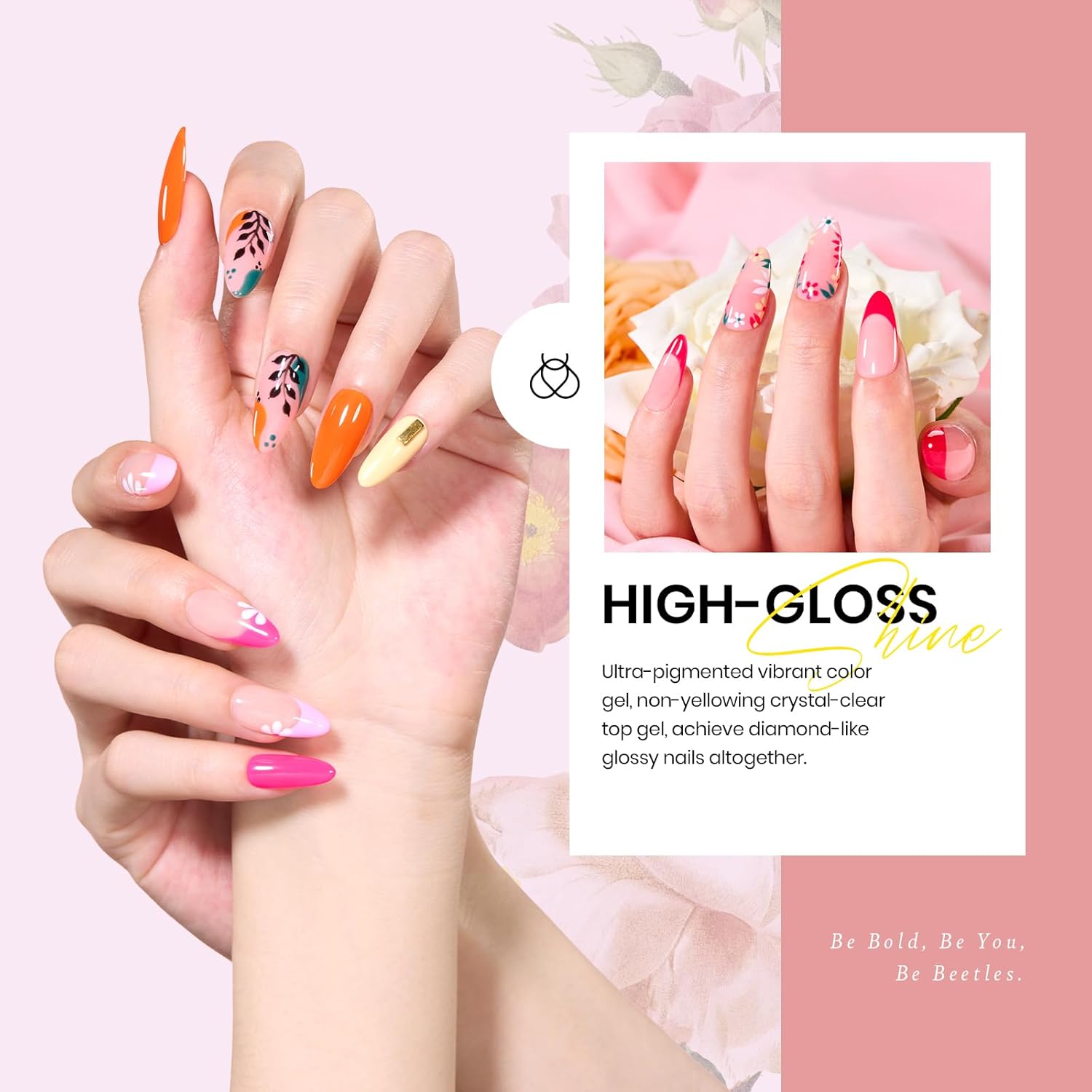 - ăHight Performanceă: Beetles all season nail polish gel 36pcs solid glitter bright gel nail polish kit is made from hight quality Ingredients, safe and low-odor. With good tenacity and highly pigmented, Beetles' premium gel material brings you a brilliant shine finish, smooth appearance, and flawless coverage. Reminder: Cure under a lamp for 60-120 seconds. Base and top coat are required.