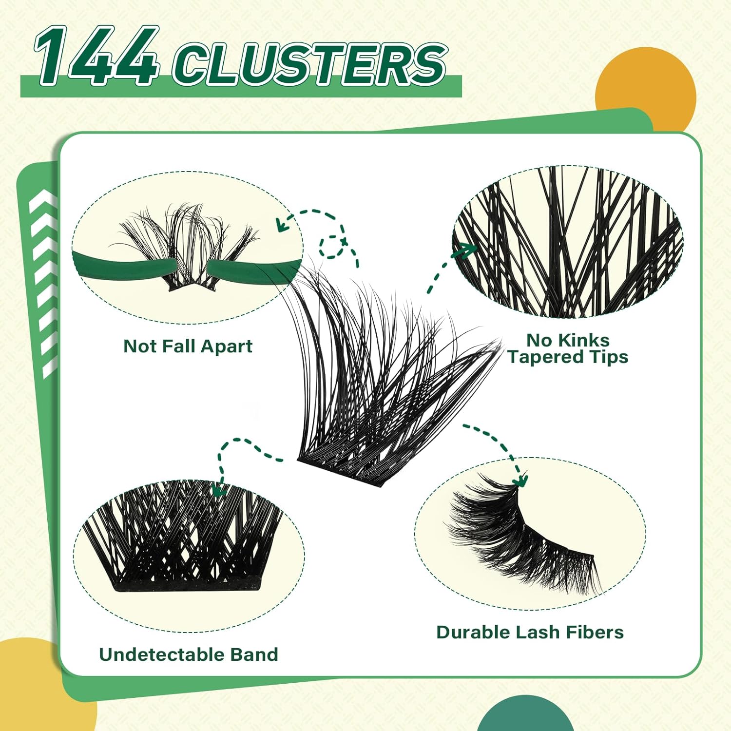 - 【Beginner-friendly Cluster Lash Kit 】The KEYYOU all-inclusive kit provides everything you need for effortlessly stunning lashes. From 144 thin band Cluster Lashes(8*1,10*2,12*3,14*3,16*2,18*1) to the Lash Bond and Lock, Cluster Lash Remover, Applicators, lash brush and cleaning pads, we've got you covered from start to finish.