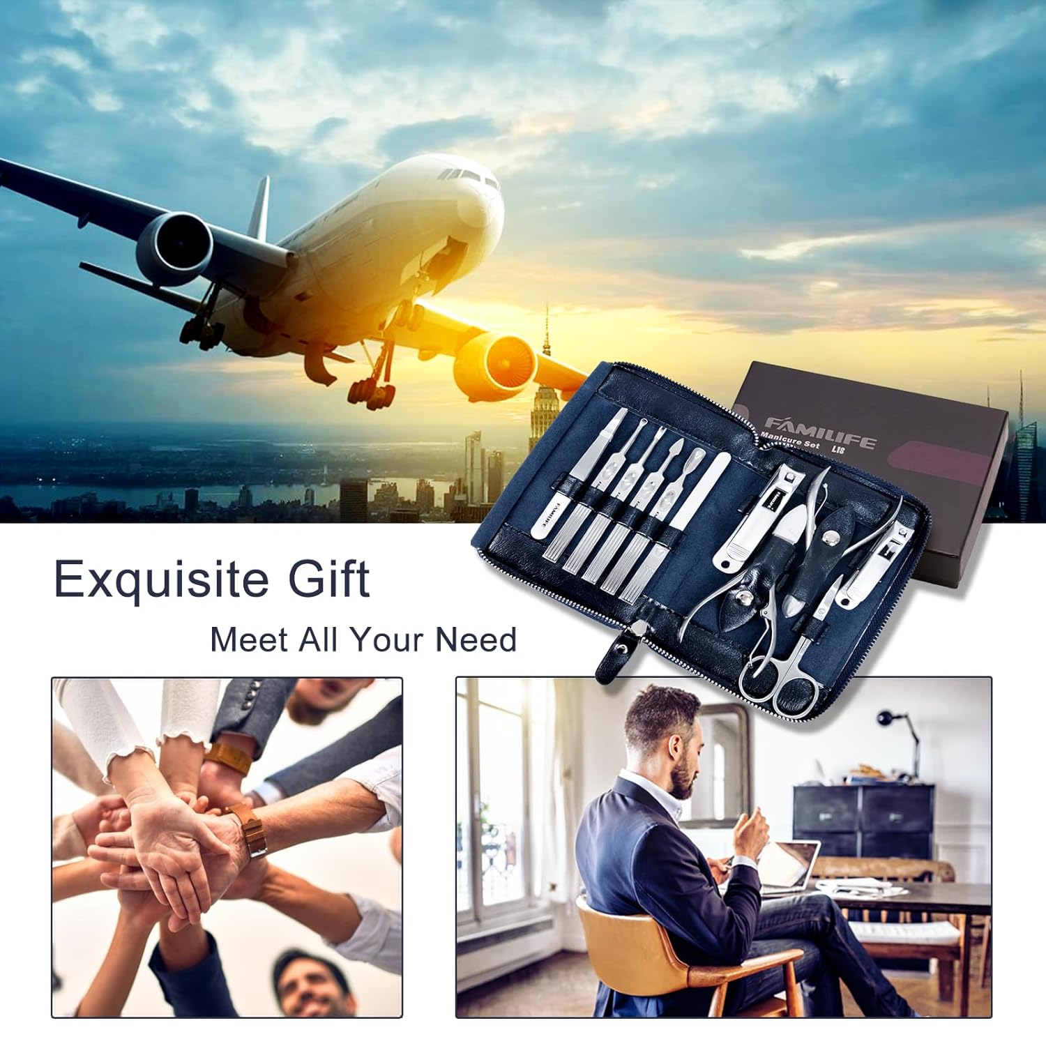 Manicure Kit, FAMILIFE Professional Manicure Set Nail Kit, 11 in 1 Stainless Steel Nail Clippers Set for Men Pedicure Kit, Men Grooming Kit with Portable Blue Leather Travel Case Luxury Gifts for Him