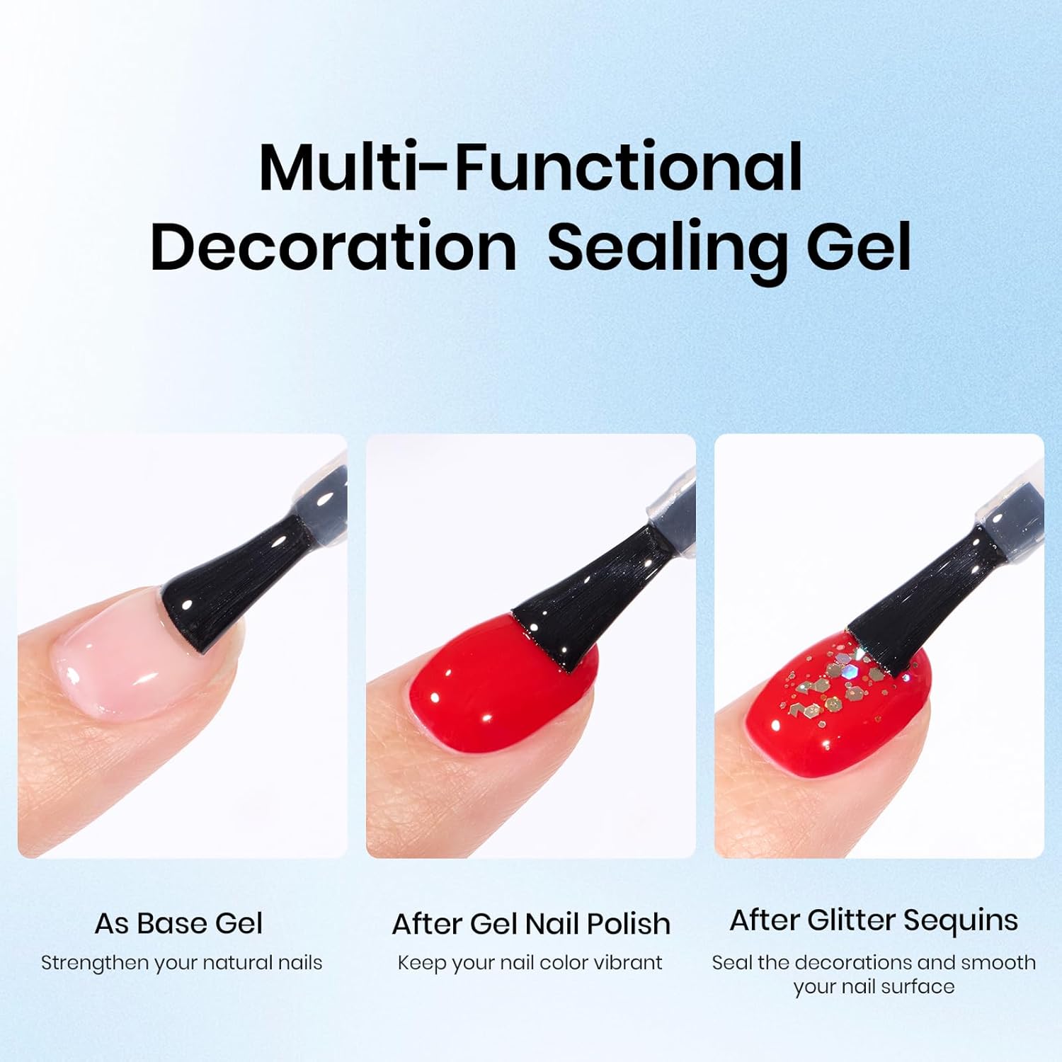 - ăWidely UsedăThe decoration sealing gel can as rhinestone gel glue to attach small nail art accessories (small rivets, sequins), super adhesive won't fall off easily! Moreover, it can as as a moulding and reinforcing gel to make the nail surface smoother.