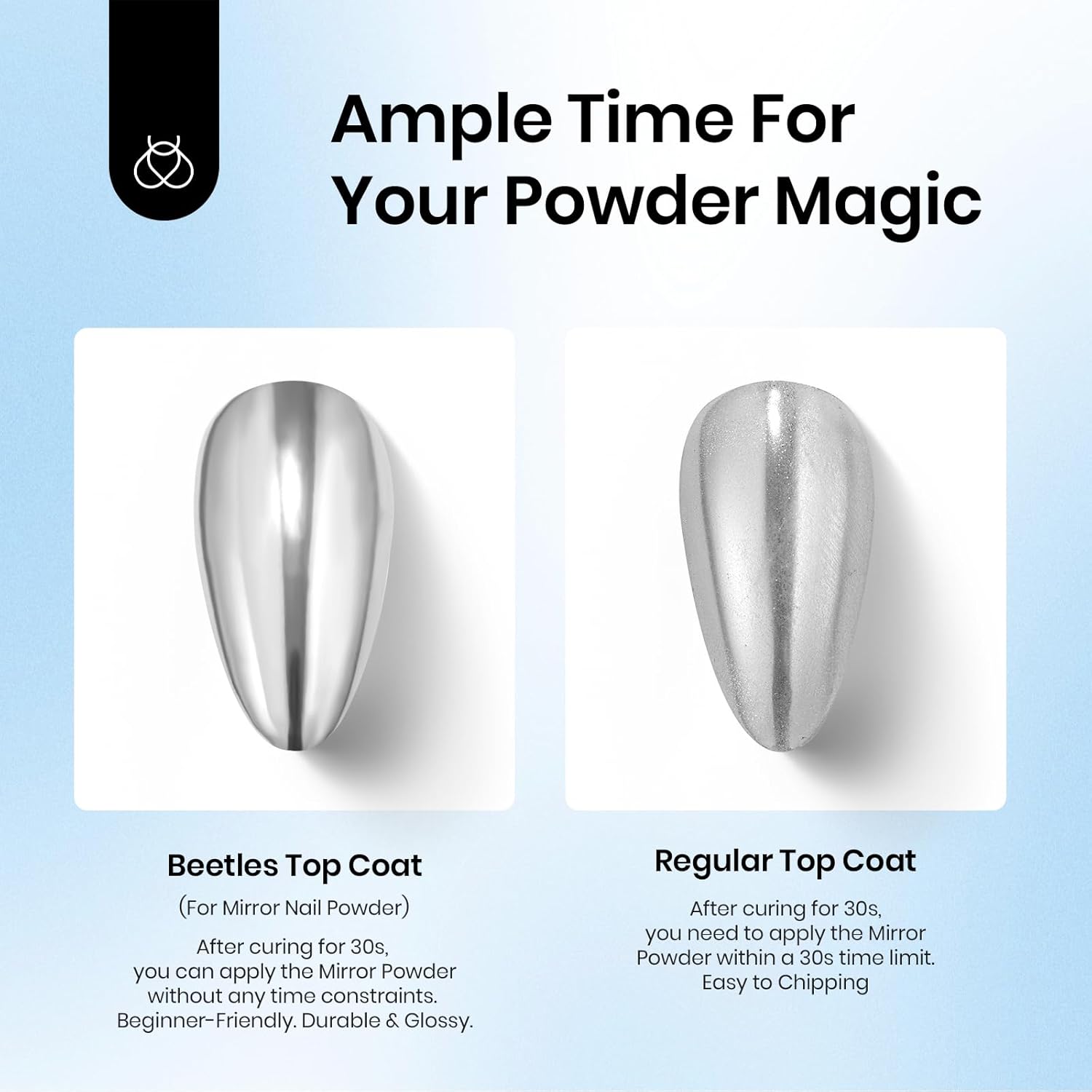- ăTop Coat for Chrome Nail PowderăThe beetles Top coat gel for chrome nail powder is highly translucent and does not yellow. After completing the nail design, the top coat keeps the beauty and effect of the nails. Top Coat is suitable for all kinds of nail decorations. Glossy Nail Polish Gel can be used with any other nail polish gel.The decoration glue gel reinforces nails in a mere 3 minutes and show them off for more than 28 days with best break resistant support.