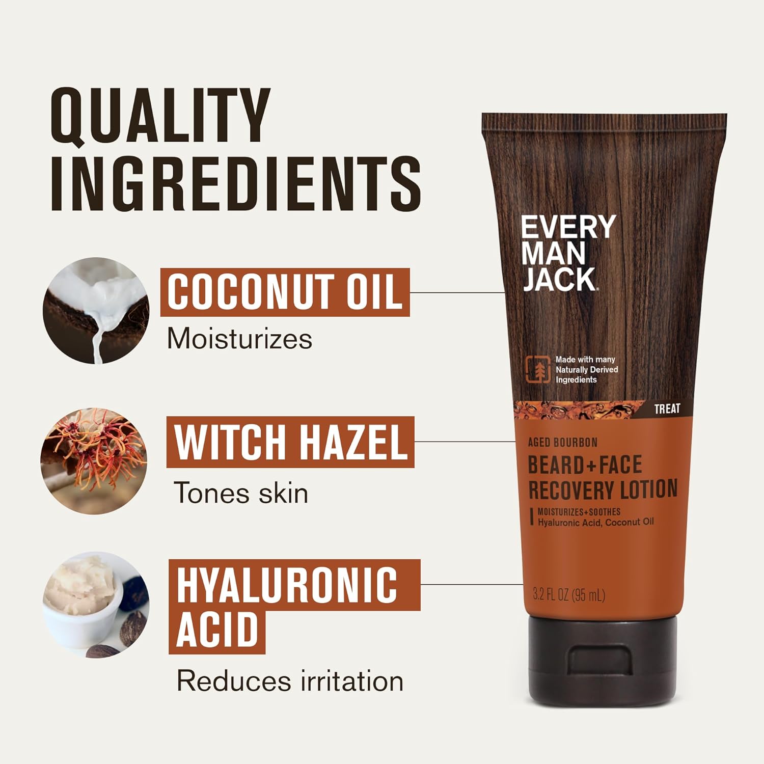 Every Man Jack Beard + Face Recovery Lotion - Moisturizes Relieves Dry Skin and Beard Itch - Light Aged Bourbon Scent - Made w/Naturally Derived Ingredients like Coconut Oil, and Witch Hazel - 3.2 oz (2 Pack)