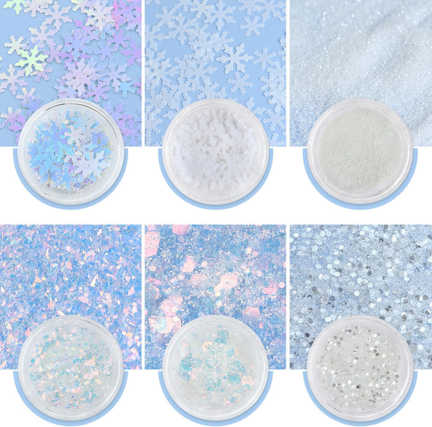 Snowflake Nail Art Glitter White Blue Winter Nail Sequins Flakes, White Manicure fine Glitter Powder, 3D Holographic Round Hexagon Nail Stickers Decals Supplies Nail Charms for Women 6 Box
