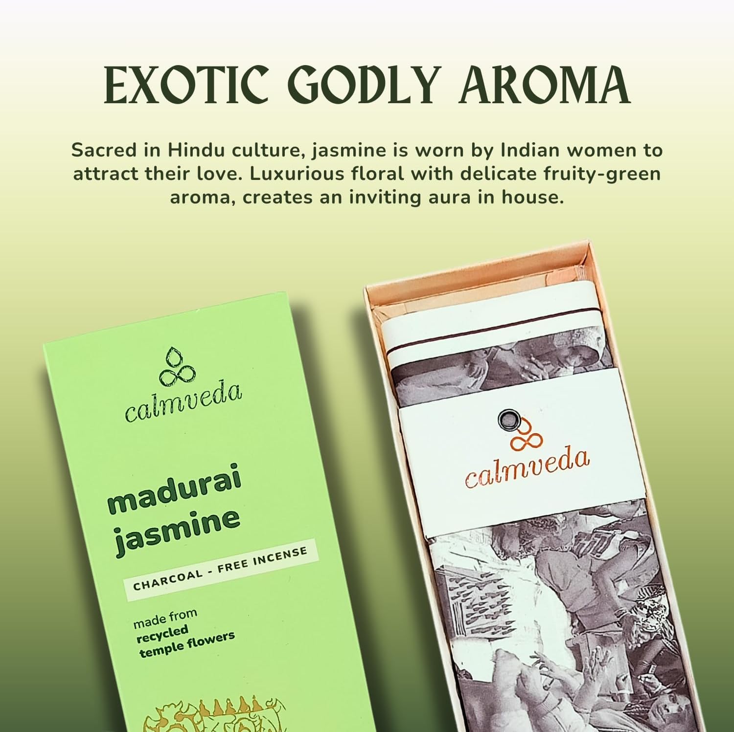 - Scent : Madurai Jasmine Incense - Charcoal Free