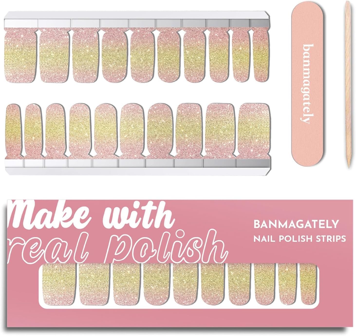 Nail Polish Strips, 20Pcs Salon Quality Gel Nail Stickers, Easy Long Lasting Wraps for Short Nails no UV Light Needed (Pink Yellow)