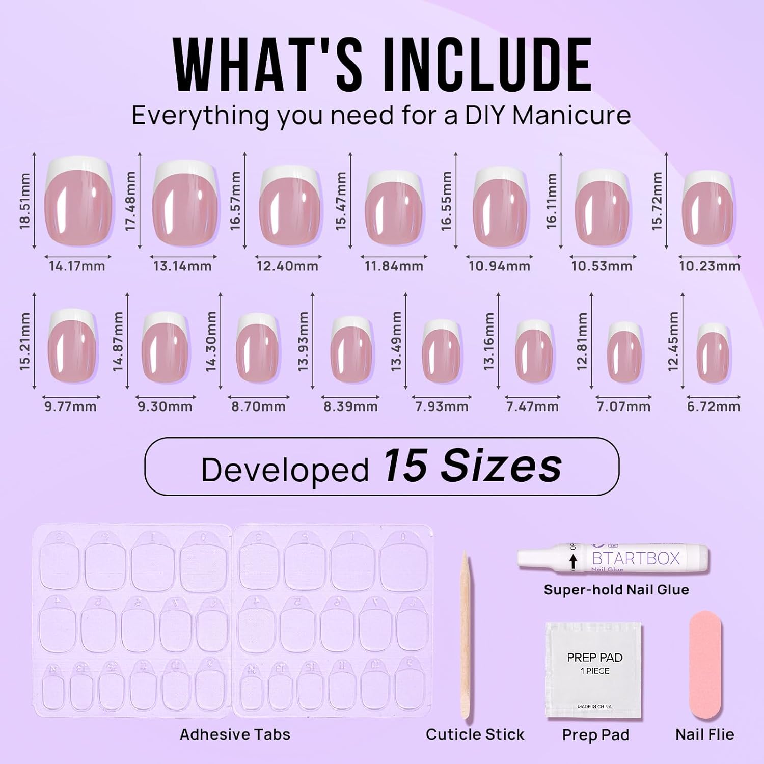 BTArtbox Press on Nails Short - White French Tip Press On Nails Square, Chrome Glazed Glue On Nails, Stick On Nails in 15 Sizes - 30 Soft Gel Fake Nail Kit, Be Elegant