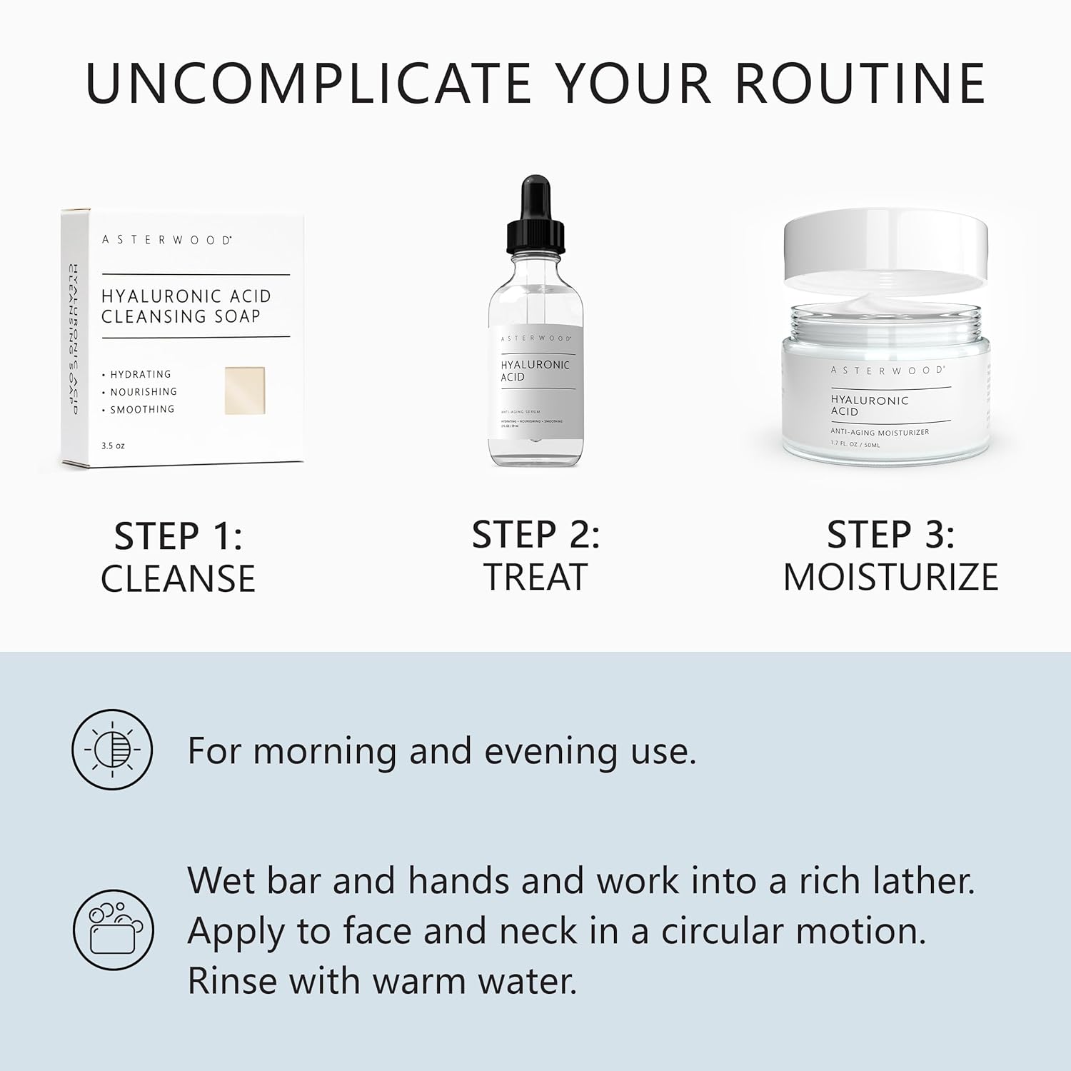 - Effective Routine: For optimal results, follow up with Asterwood's Hyaluronic Acid Serum and Moisturizer after cleansing with the soap bar, creating a comprehensive skincare routine that maximizes hydration and skin health.