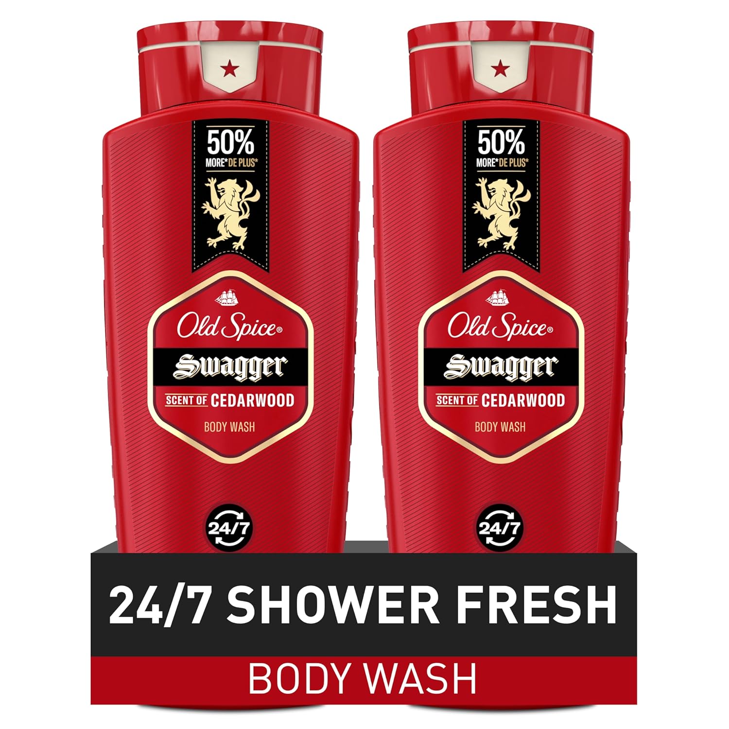 Old Spice Refreshing Body Wash for Men, 3X Defense, 24/7 Shower Fresh with Long Lasting Scent, Red Collection, Swagger with Cedarwood Scent, 24 oz (Pack of 2)