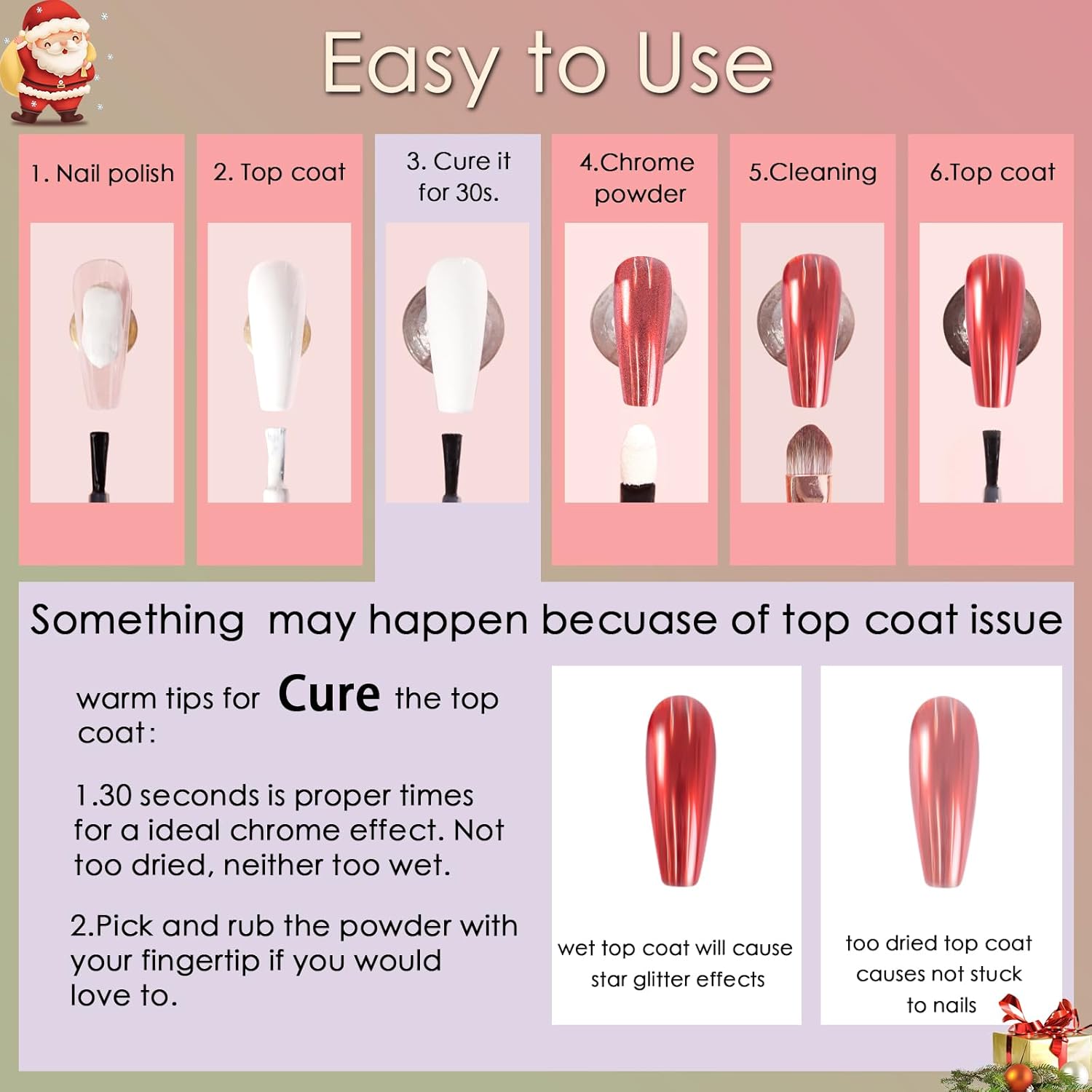 - Ultra Excellent Texture: Allstarry Metallic Christmas chrome nail powder is fine and smooth without particles feeling, so you can make your nails exquisite with an amazing mirror effect. Chrome powder palette is non-toxic, more durable, and environmentally friendly, which does not harm your nails and skin, using it more at ease. Chrome powder for gel nails is highly pigmented and provides an excellent metallic mirror effect that can last for several weeks if used correctly.