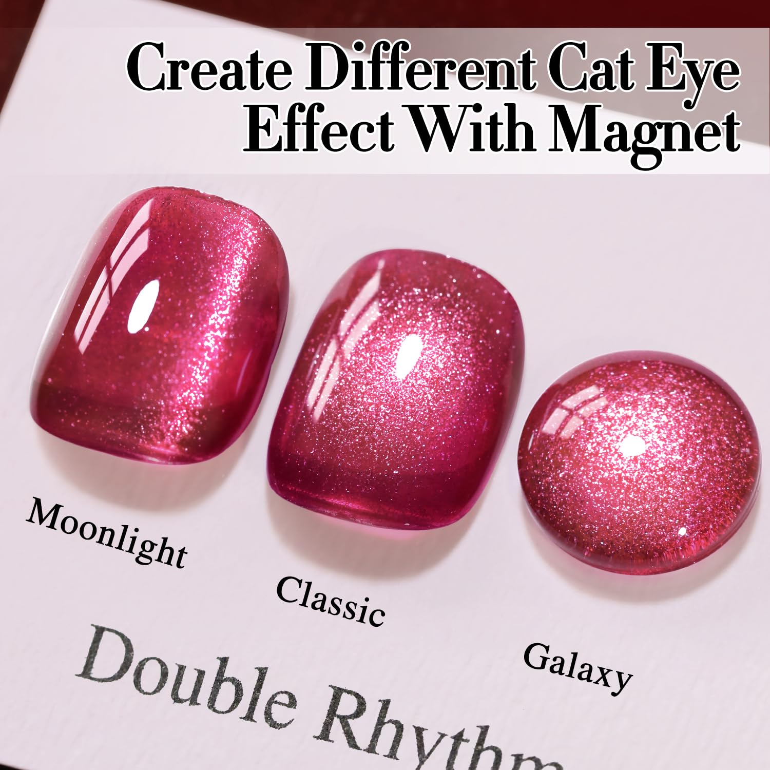 - Cat Eye Gel Nail Polish : Double Rhythm cat eye gel nail polish kit includes 1 color 15ml / 0.5 fl.oz gel nail polish. The cat eye gel can be combined with different bacse colors arbitrarily, you can get different colors nail art.Each kit comes with one magnetic tool for you to create a different cat eye style for your nails.