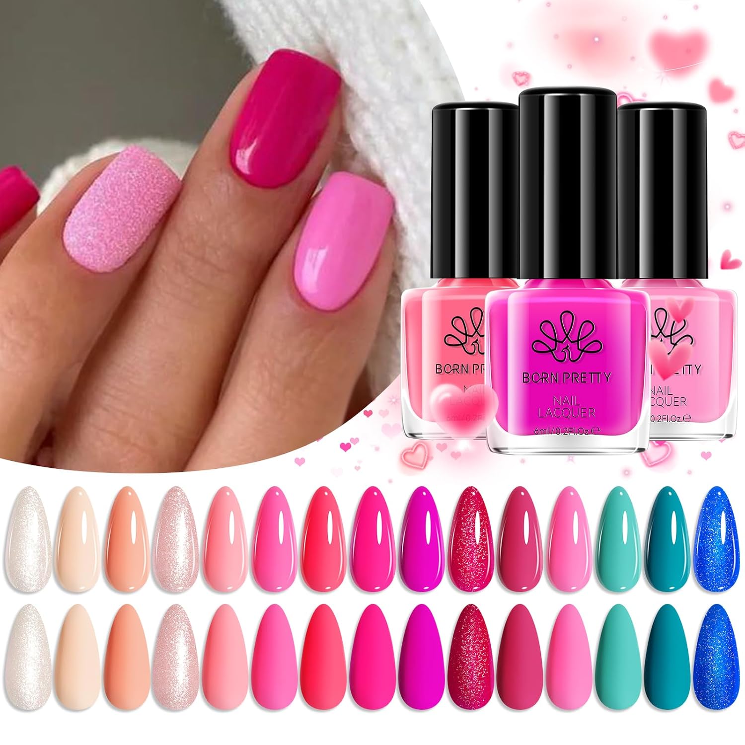 Born Pretty Pink Nail Polish Set Fingernail, 15 Colors Natural Pink Nude Neon Pink Hot Pink Bright Summer Quick Dry Nail Lacquer Glossy Nail Polish All Seasons Manicure Suitable Wedding Holiday