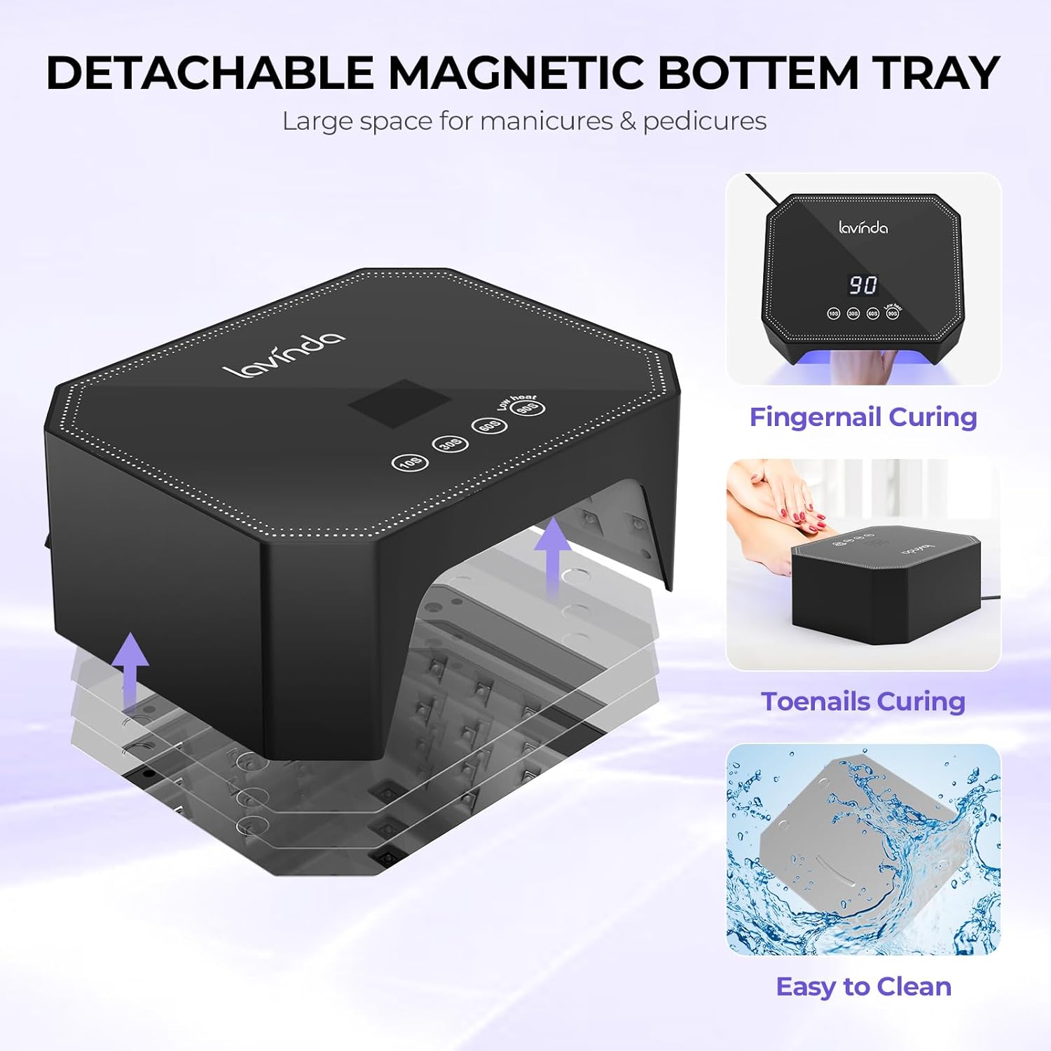 - Detachable Base & Large Space UV Lamp for Gel Nails: Featured by a removable magnetic bottom tray, Lavinda UV lamp for UV gel nail dryer has larger space after disassembling the base, making both manicure and pedicure easier and more comfortable to operate. In addition, the metal mirror base can better refract the light source and quickly dry the nails evenly. It is ideal for professional salon and home use as your lampara led para uñas profesional.