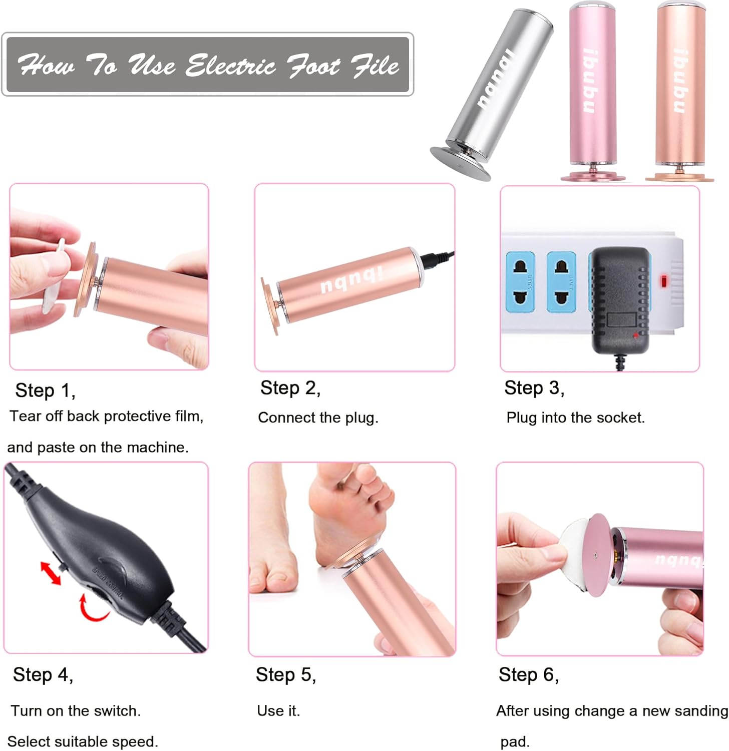 - 【ibubu Packaging Details】1 x elelctric foot file, 1 x box repacement sandpaper disk(60pcs), 1 x US plug, 1 x user manual. Please note that our Electric Feet Callus Remover products and packaging both feature our brand logo 'ibubu'. Products without the 'ibubu' logo are not produced by our manufacturer