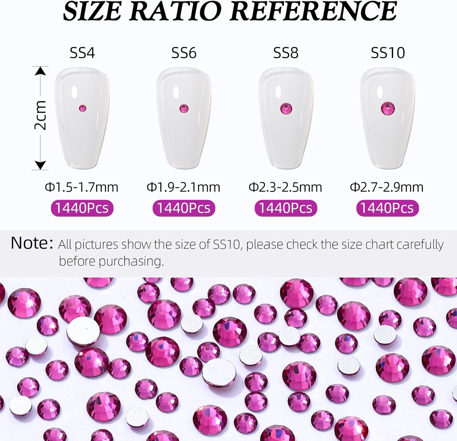 Fuchsia Flatback Rhinestones, Glass Rhinestones for Nail Art and Craft, Glue Fix, Loose Crystal Gemstones(Fuchsia, SS6, 1440pcs, 1.9-2.0mm)
