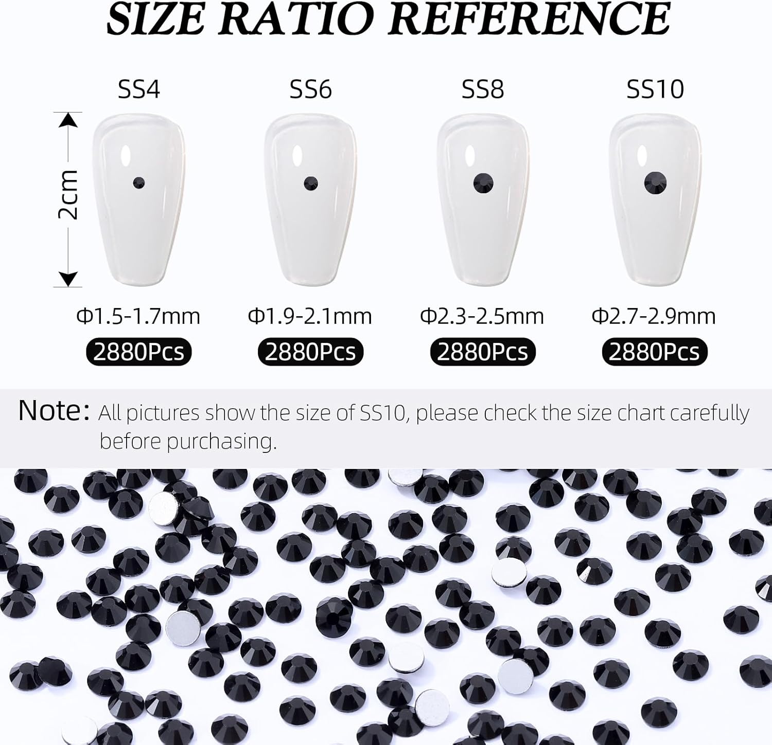 Black Flatback Rhinestones, Glass Rhinestones for Nail Art and Craft, Glue Fix, Loose Crystal Gemstones(Black, SS6, 2880pcs, 1.9-2.0mm)