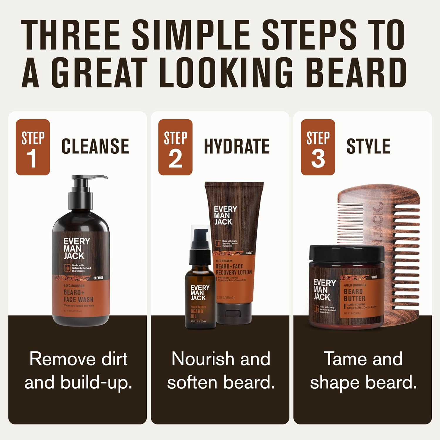 Every Man Jack Mens Aged Bourbon Beard Set - Five Full-Sized Grooming Essentials For a Complete Routine - Beard + Face Wash, Beard + Face Lotion, Hydrating Beard Oil, Beard Butter, and Beard Comb