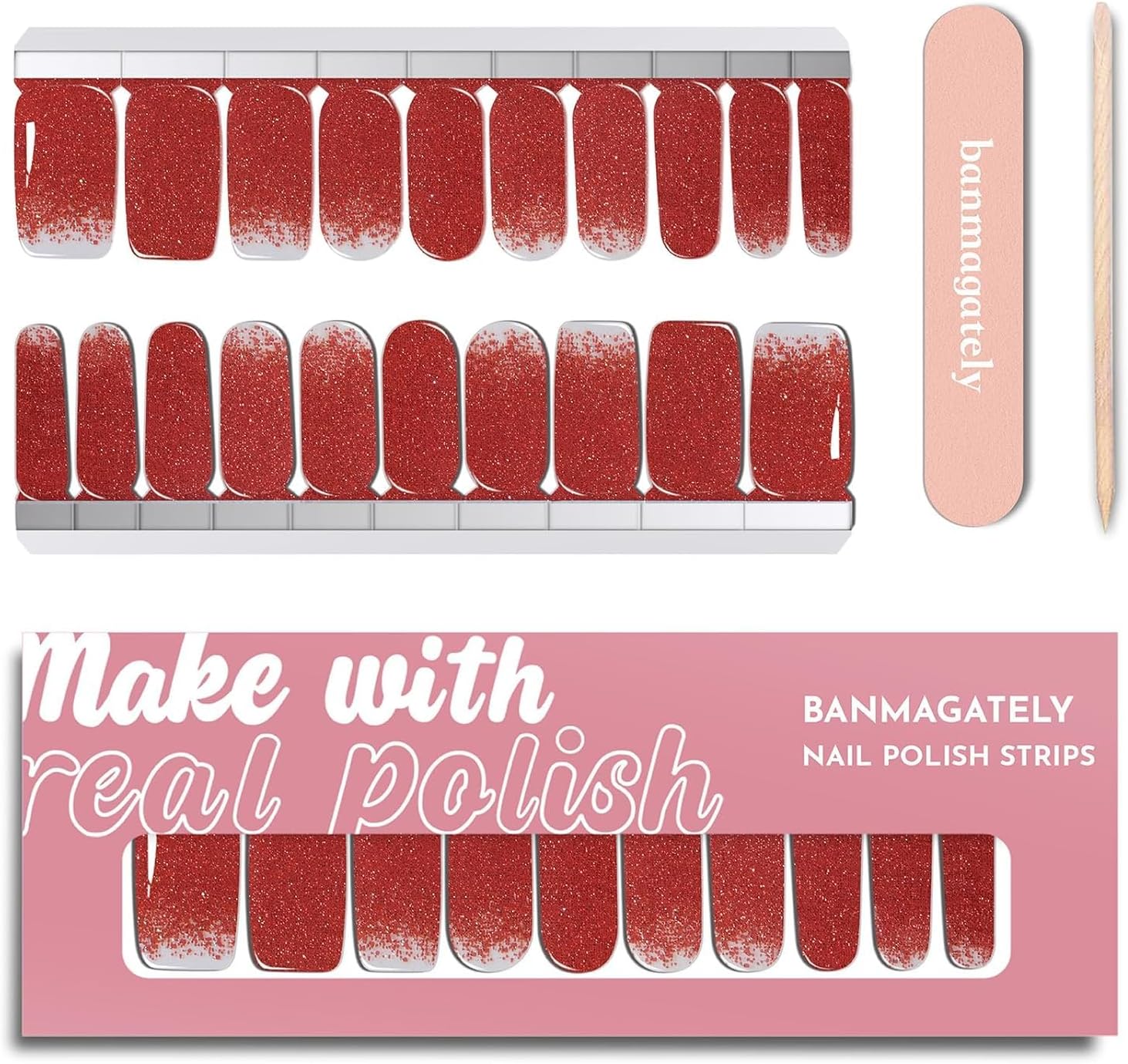- Quick & Easy Application:Achieve a perfect manicure in minutes! Simply select the right size strip, peel off the protective layer, and apply. Stretch, fold under the nail tips, and trim excess with the included nail file. To remove, just peel from the cuticle end—no hassle, no mess.