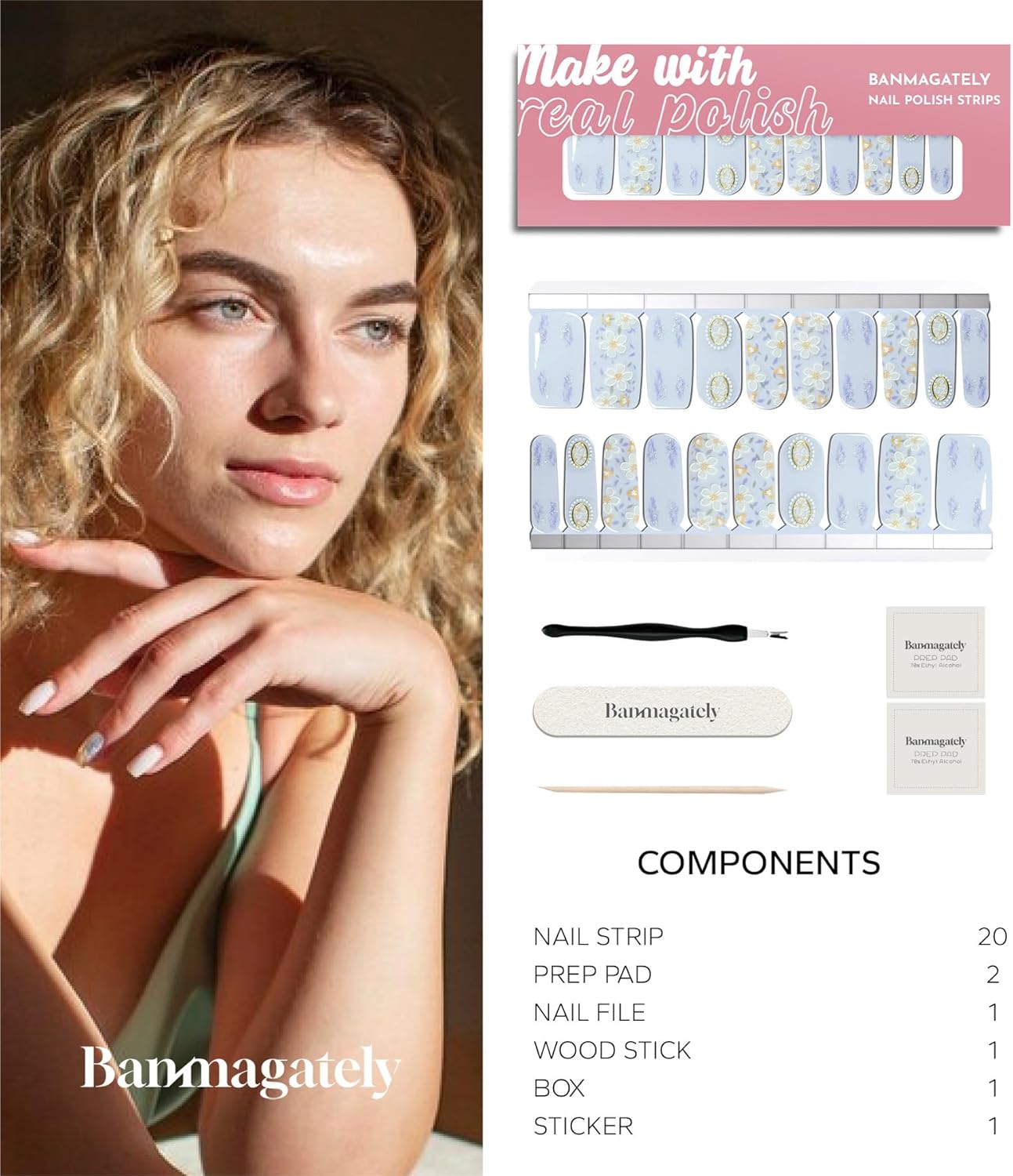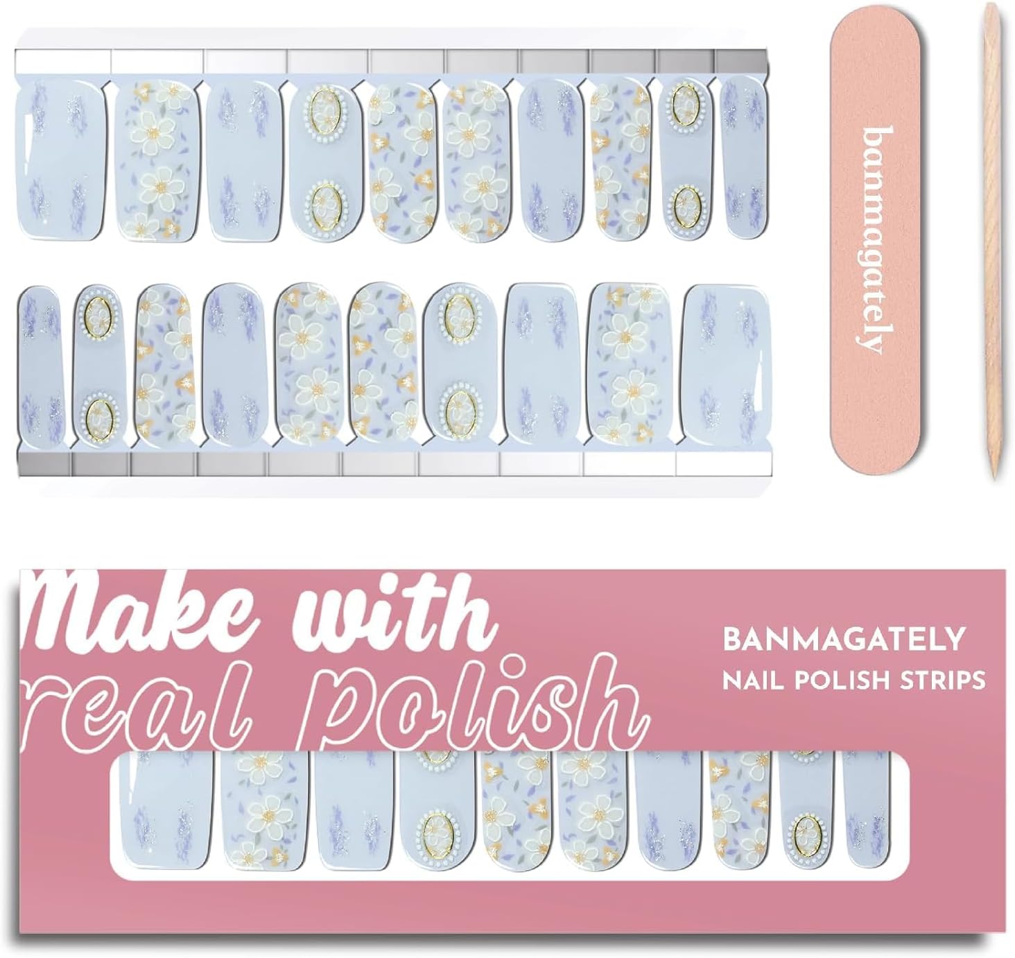 - Package Include: The whole product includes 20 pieces Water resistant Polish Nail Strips , 2 Cleaning Wipes, 1 Wood Stick, 1 Nail File, and 1 instruction manual.