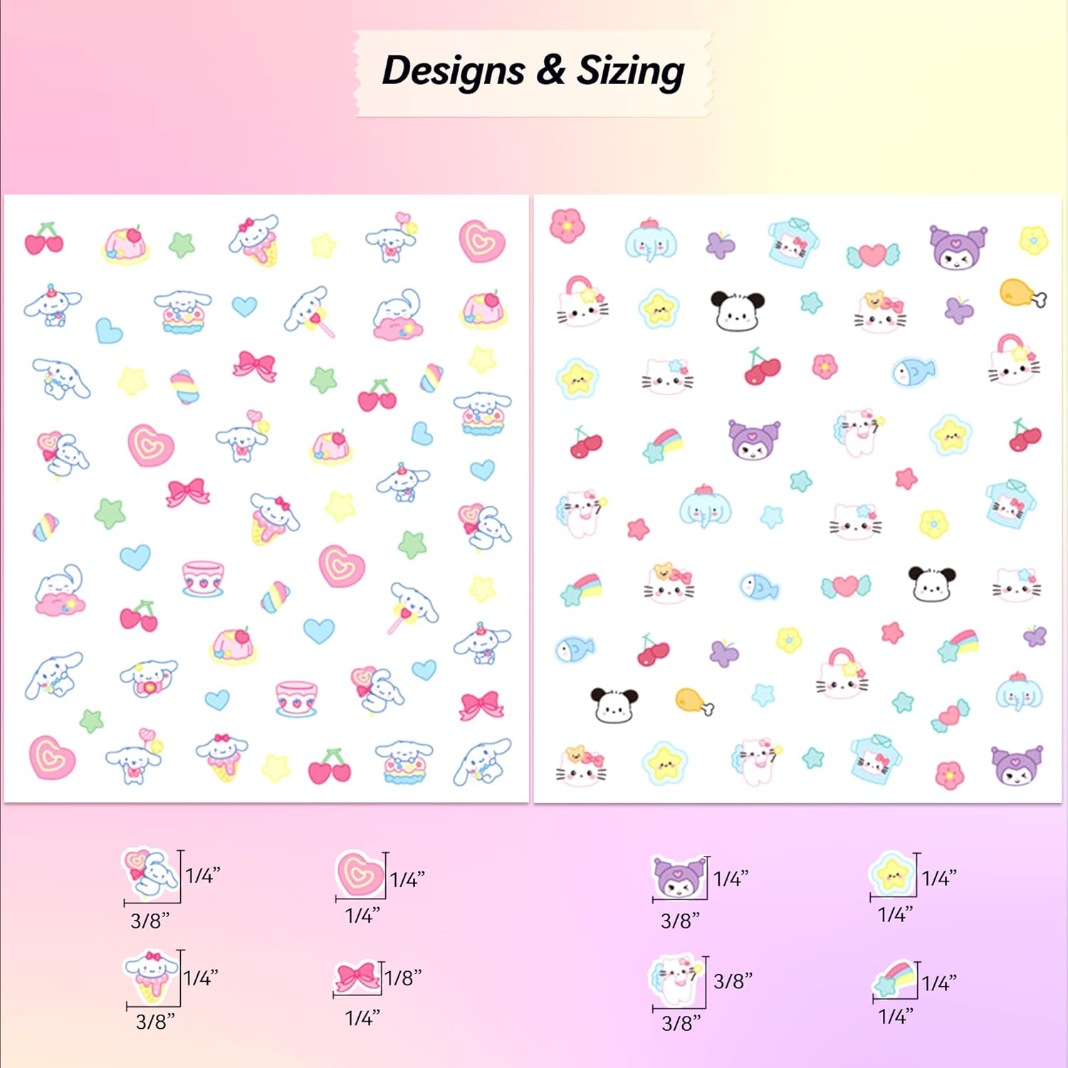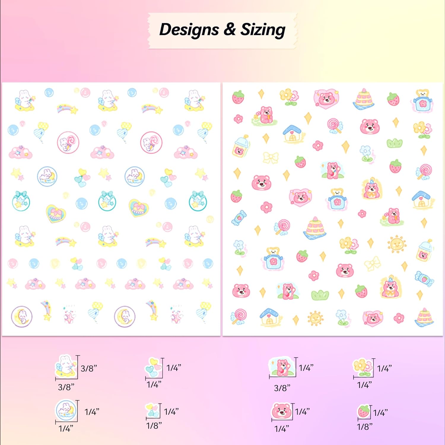 - KAWAII CUTE NAIL ART STICKERS: Decorate with these nail stickers featuring a serene white kitty with a signature bow, plush-like pink bear who loves lots of hugs, jester-like rabbit, a sweetly silent puppy, and a jubilant jumbo. Step into a world of adorable animations and pastel colors, where each design is pure cuteness.