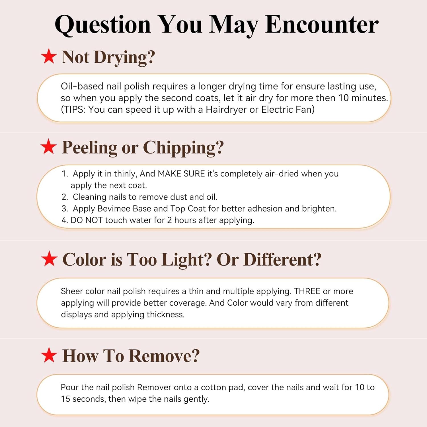 - Air Dry Fast: Get stunning nails in a snap with Bevimee nude nail polish! Bevimee nail polish non gel, goes on smoothly, Say hello to fast drying, no UV naill lamp needed, no more waiting around for hours, really get out the door quickly