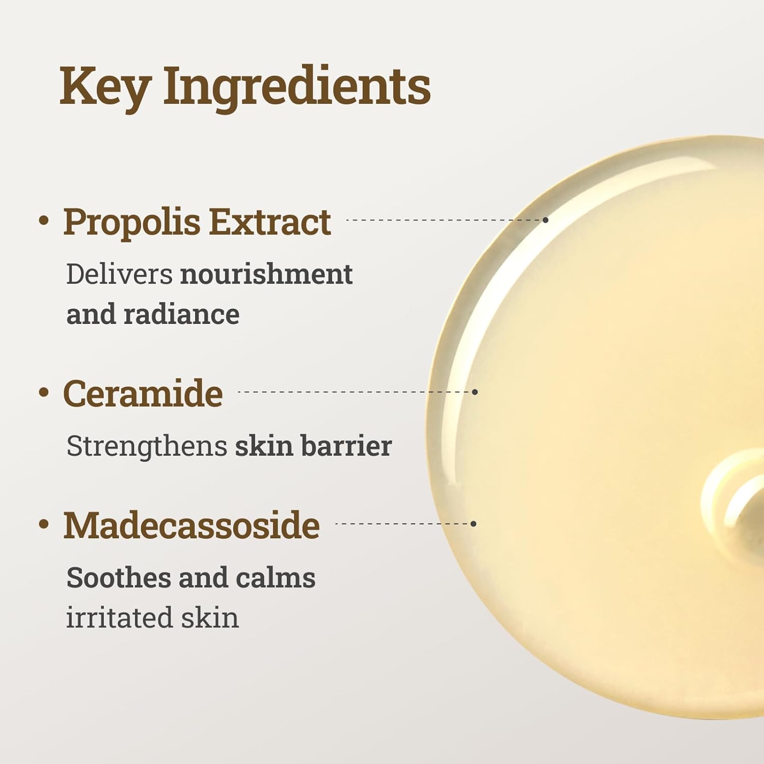 - [KEY INGREDIENTS] Formulated with 1,000 ppm propolis extract, effective in soothing and nourishing the skin. Also infused with amino acids and ceramides for hydrating care, and madecassoside for soothing care.