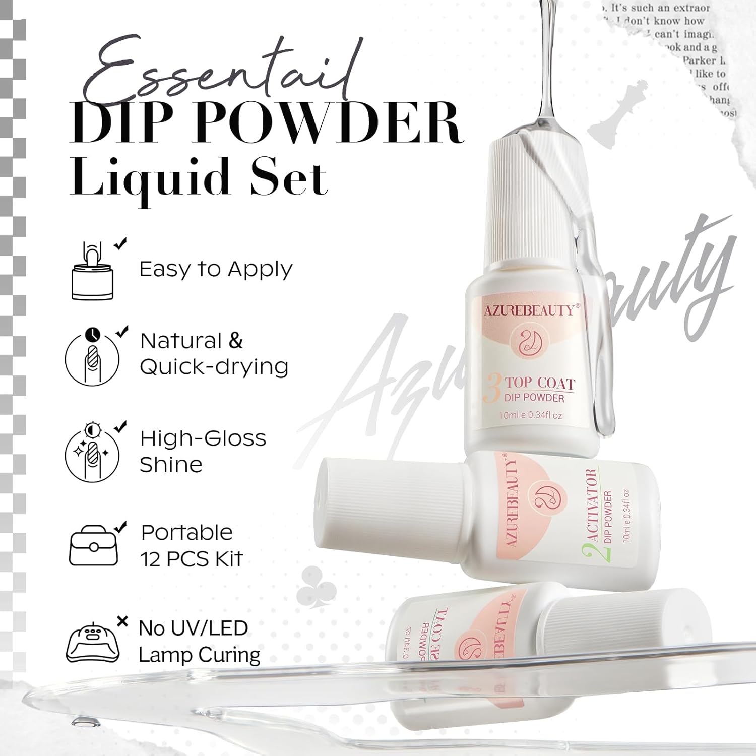 - What U Get: AZUREBEAUTY 12 PCS elegant dip powder nail starter kit—4*10 g color powder(pale gray, celadon, steel grey, shimmery black), 3*10 ml liquid set(base coat/activator/topcoat), 2*liquid brush replacement, 1*nail brush,1*nail file, 1*dip powder recycling tray