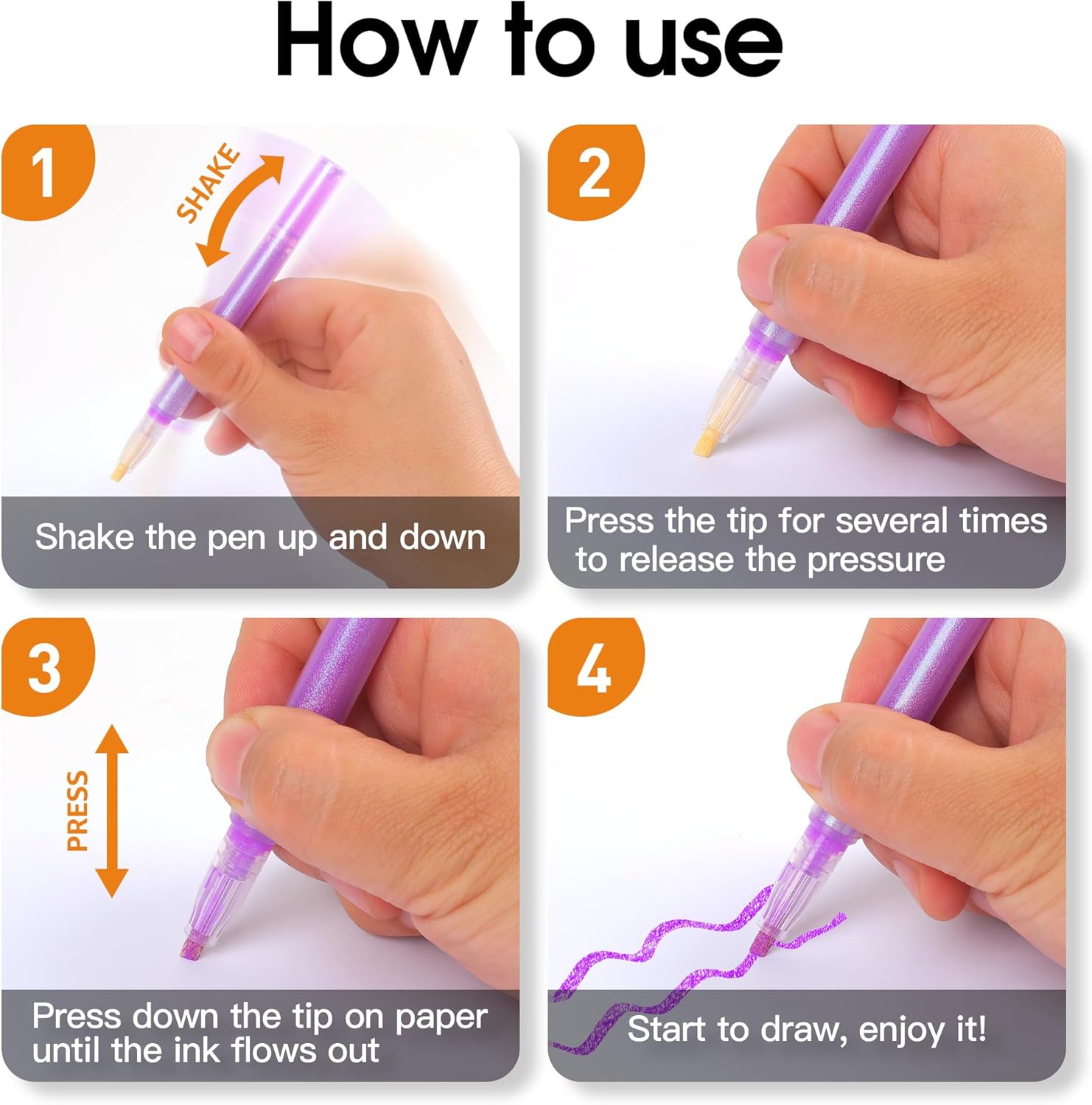 - PRESS INK-OUT TIP: The high quality nylon chisel tip is designed as a press ink-out style. It can control the amount of ink coming out and prevent the ink from drying out. Shaking the pen with the cap on it to mix the ink before using, then take off the cap and press the tip on the paper for several times until the ink comes out. To extend the service life, please remember to recap the markers and place them horizontally after use
