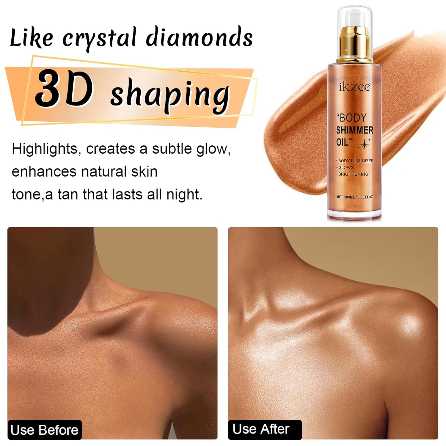 - ✦ SHIMMERING BODY GLOWING LUMINIZER -- This shimmer body oil brightens your complexion, the flecks of shimmer catch the light and make your skin glow, giving your skin an attractive shimmer in the sun, giving you a more natural and healthier complexion.