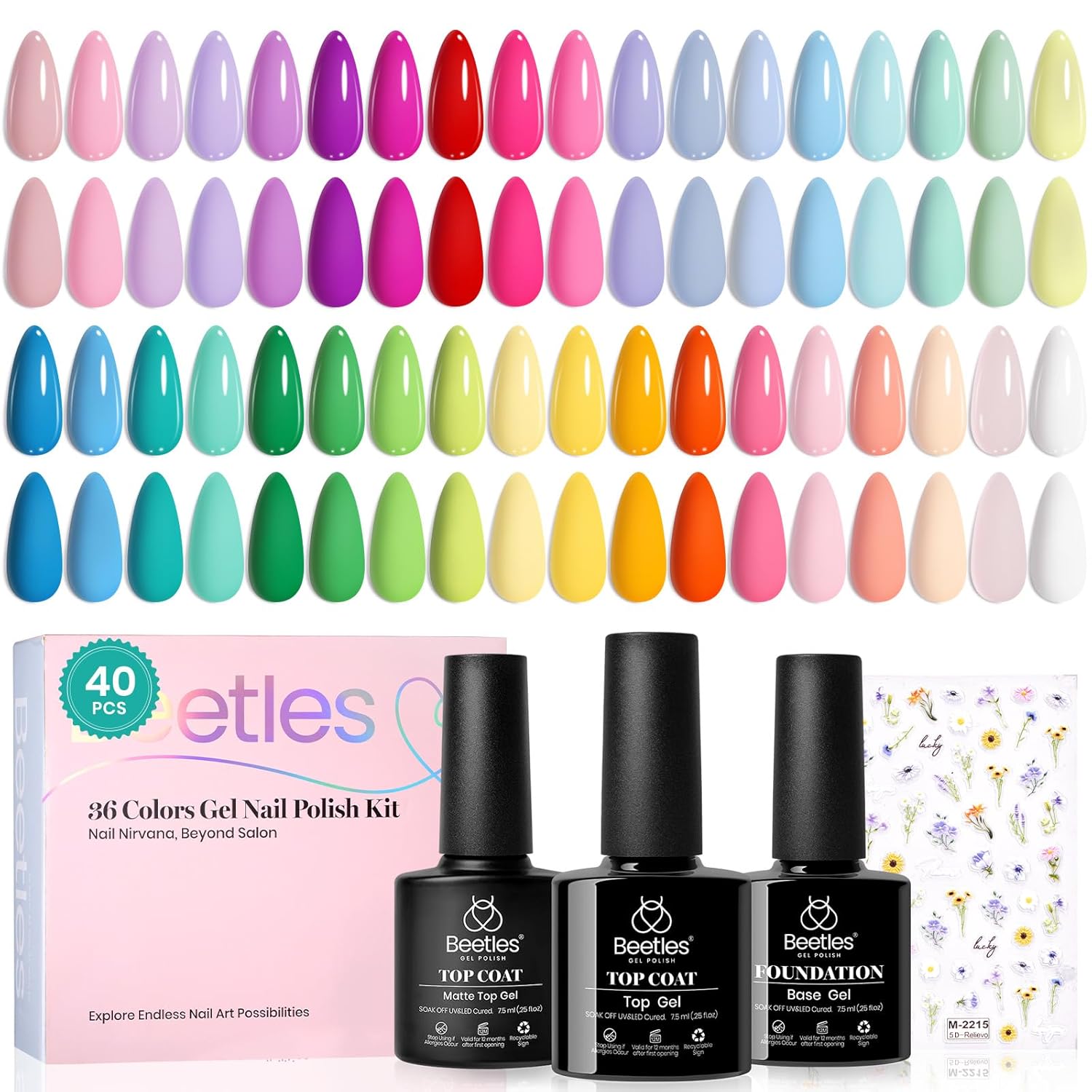 - ăWhat You Getă: Beetles 40 Pcs UV gel nail polish set include 36 x Mini All Season Gel Nail Polish + 3 x No Wipe Base and Glossy and Matte Top Coat +1x Floral Stickers , 1 x Instruction Manual . This natural green red blue purple pink orange gel polish set is an essential for everyone!