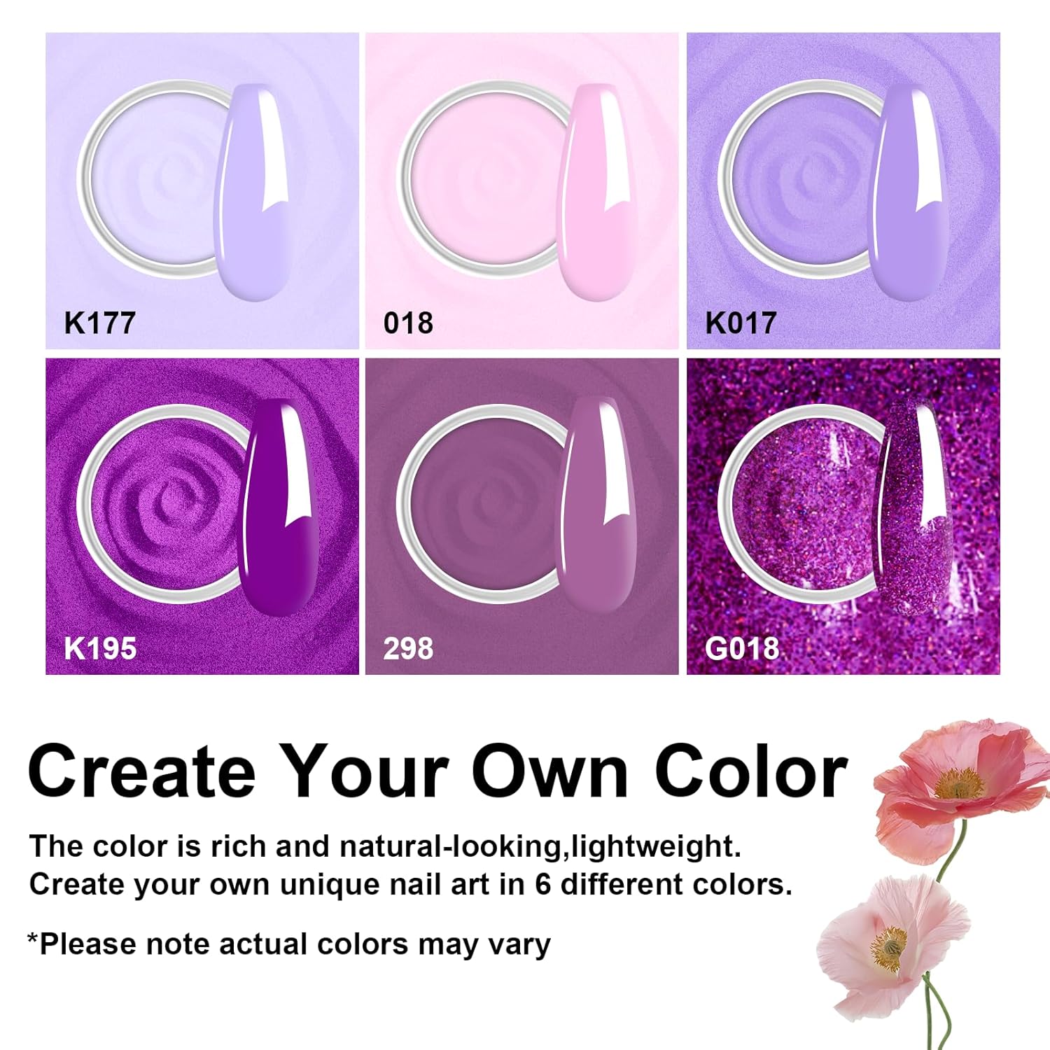 Dip Powder Nail Set, 6 Colors Purple Series 12 Pcs Dipping Powder Kit With Base & Top Coat/Activator/Brush Saver,Nail Art Dip Manicure Kits Odor-Free&Long-Lasting, No Needed Nail Lamp Curing