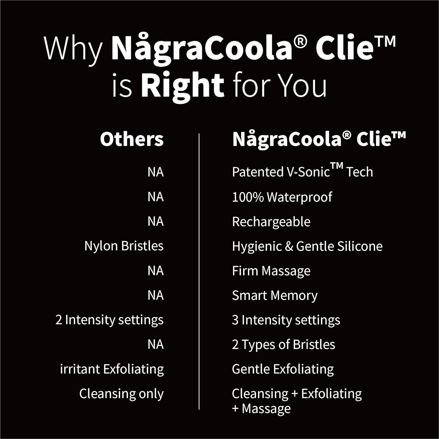 - DEEP CLEANSING: It features an iconic handle design. CLIE 2.0 face cleansing brush equips professional-caliber technology that uses pulsation to cleanse deeply. Featuring sophisticated V-Sonic Tech, NågraCoola face scrubber gently clears pores without harsh abrasion or chemicals, cleansing so effectively that skin care products absorb better. Results includes 6X better cleansing than manual cleansing, reduce appearance of pores, and improve skin tone.