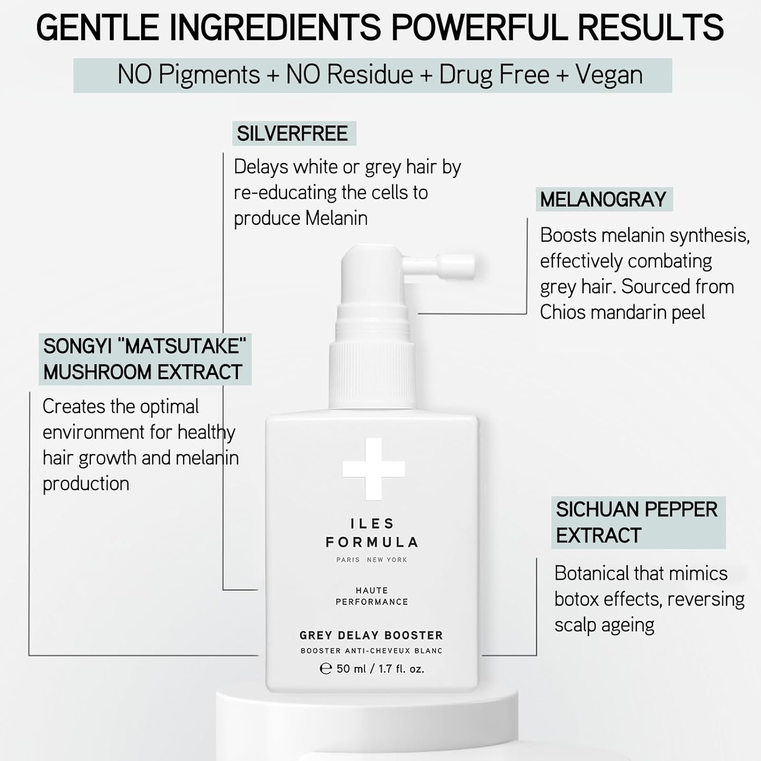 ILES FORMULA Grey Delay Booster – Anti-Gray Leave-In Hair Treatment, Prevents Premature Graying & Stimulates Melanin Production, Plant-Based w/Chios Mandarin & Matsutake Mushroom, 1.7 fl oz (50 ml)
