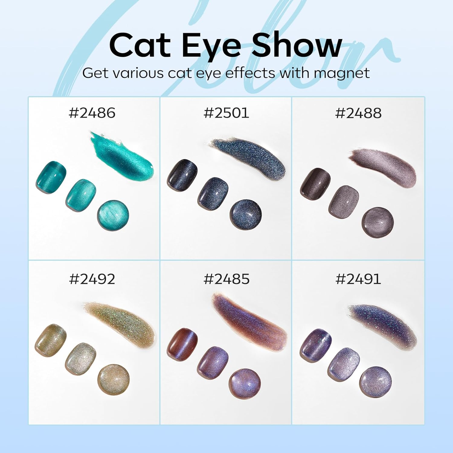 - [ What You Get ]: 6 Colors of blue green purple black Holographic Glitter Cat Eye Gel Nail Polish Set (7ml each) + 1 Double-Head Magnetic Stick for various cat eye designs. Practice makes perfect!