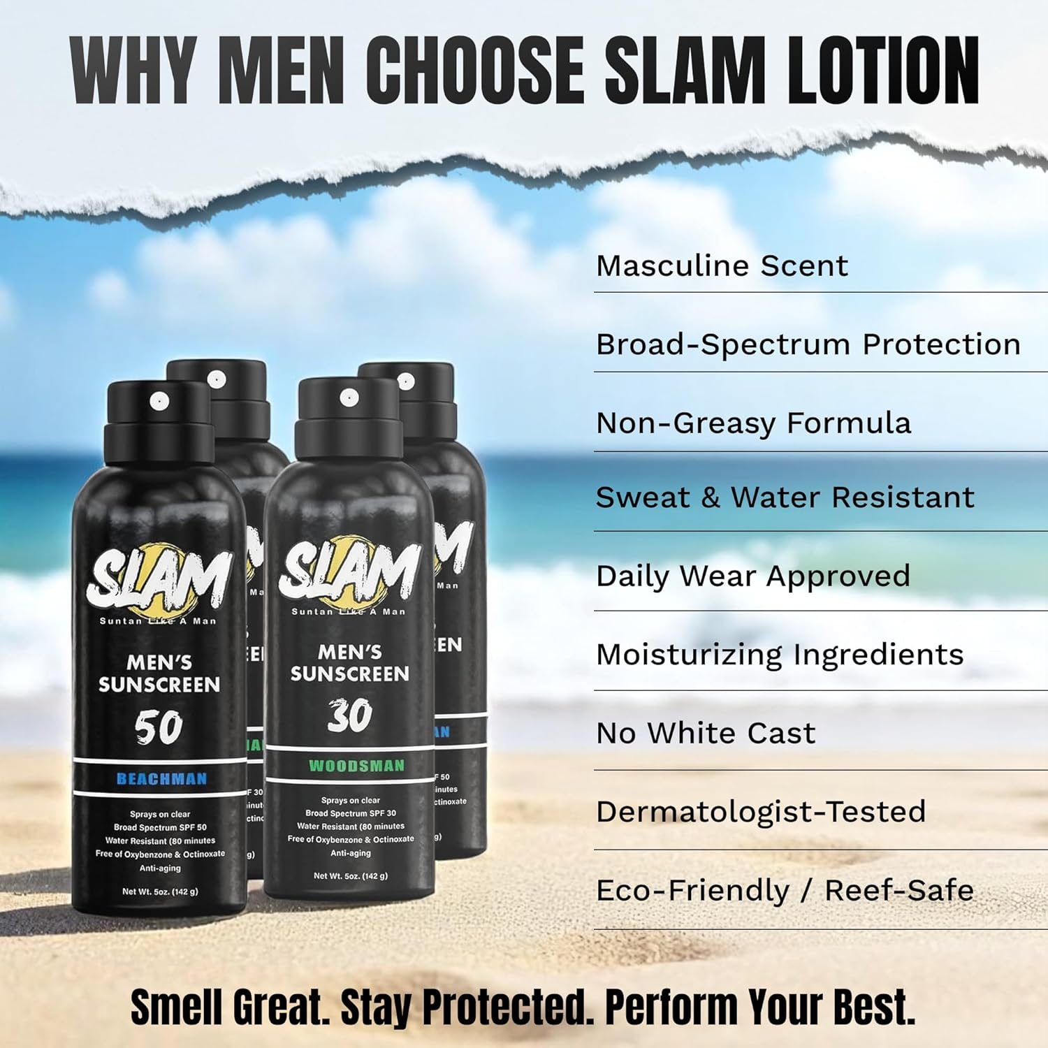 - Manly Cedarwood Scented Sunscreen Spray: Embrace the rugged aroma of cedarwood with this men’s sunscreen spray. Slam Lotion BeachMan SPF 30 sun screen spray keeps you protected and smelling great on every outdoor adventure. The perfect size sunscreen spray.