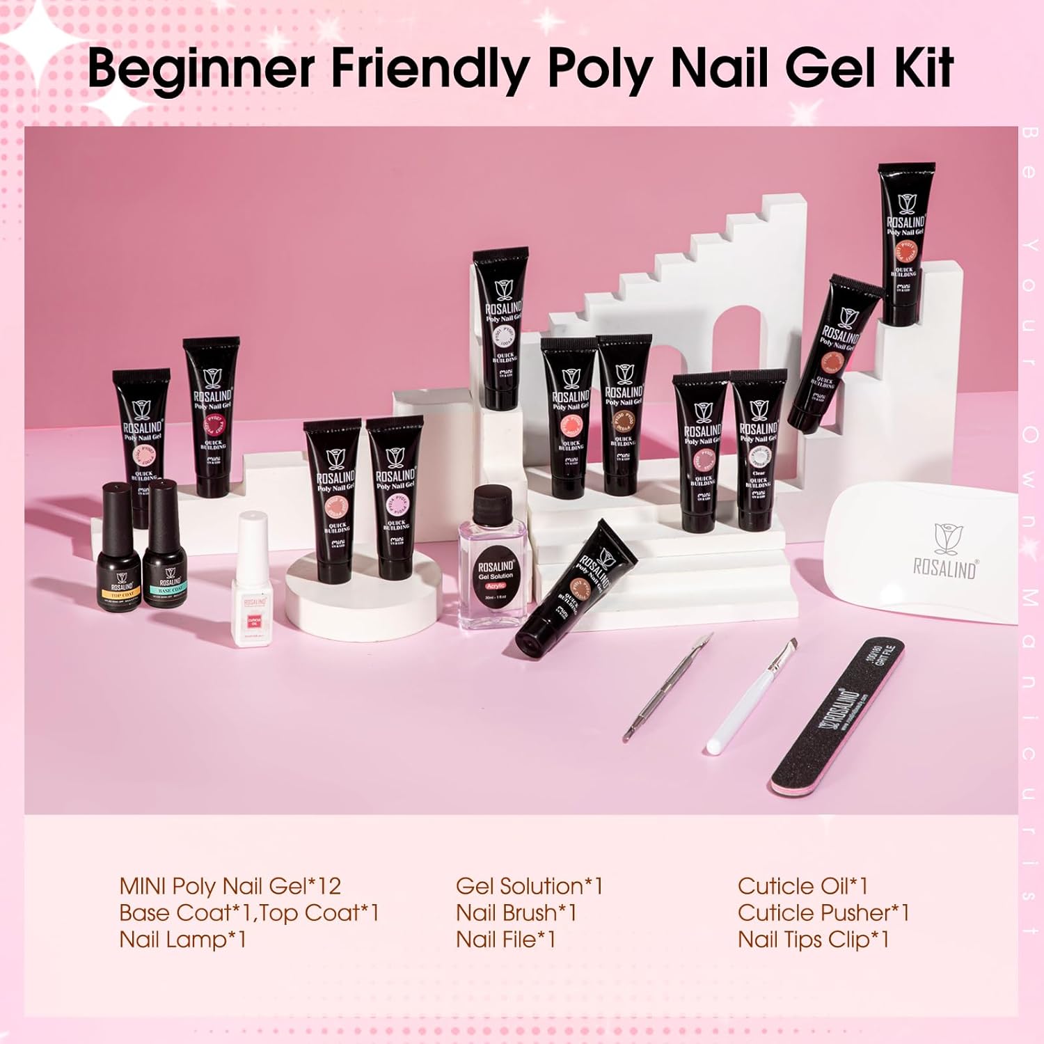 - FAST& Convenient: ROSALIND nail extensions gel kit is a multipurpose object that can be used for the acrylic nail enhancement of natural nails, but also for nail carving, sculpting nails, French nails, 3D nail design decoration, etc.ROSALIND poly nail gel kit is stronger, and more flexible. The poly nail gel kit with UV nail lamp makes your nails look charming and neat.