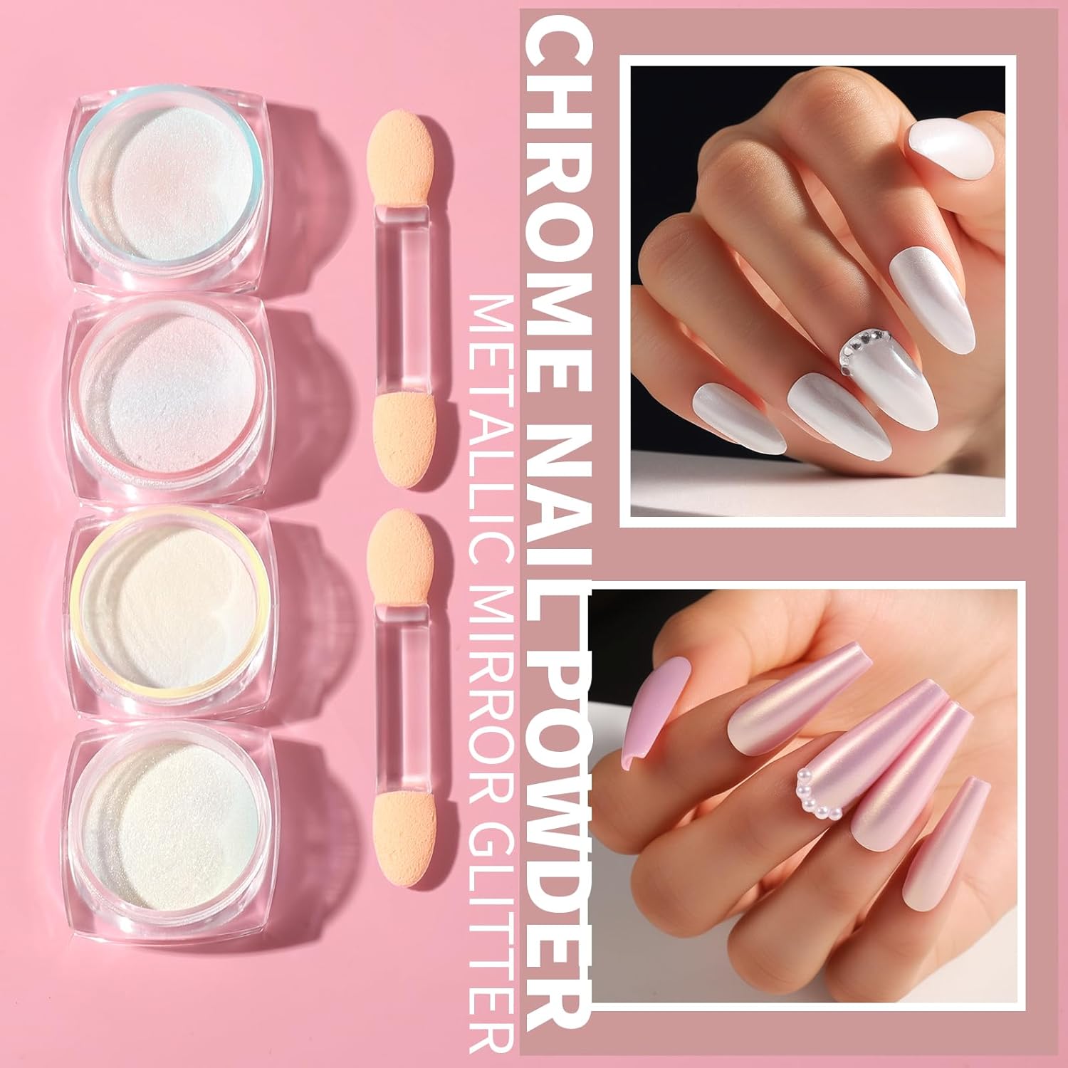 - Chrome Nail Powder: 4 color pearl chrome nail powder: iridescent blue, pink, yellow and pearl white. Each color have 1 gram, widely used for UV gel nails, acrylic nails, natural nails and false nail tips. Super shining metallic mirror effect nail glitter powder. You can make different mirror effect with different base coat color. 10 sheets self-adhesive flower nail stickers for nail art in different patterns, colors and styles. 3D nail art sticker decals make you nail art more delicate.