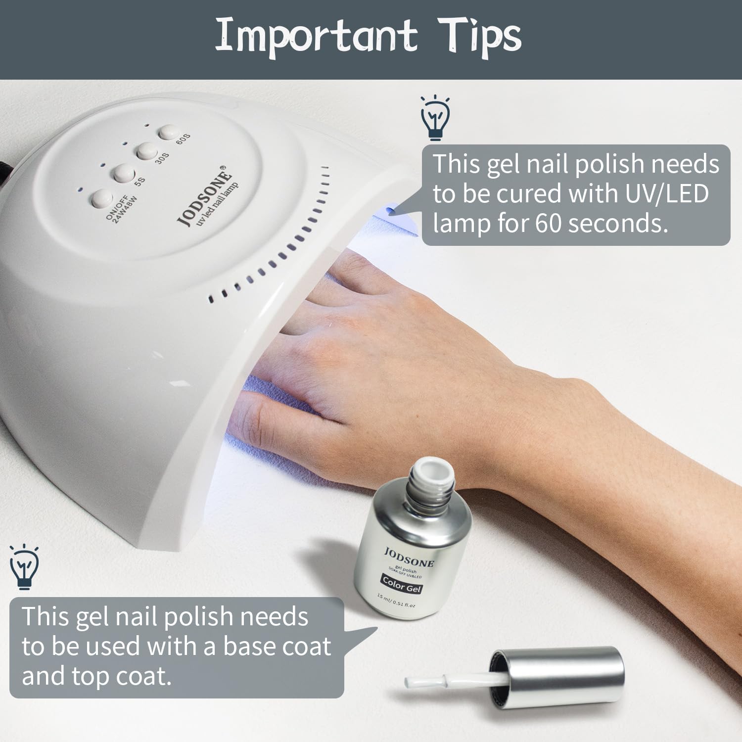 - Quick Cure With Led Nail Lights: Gel Nail Polish Kit requires curing under LED lights. Requires base coat and top coat.LED light averages 60-120 seconds.