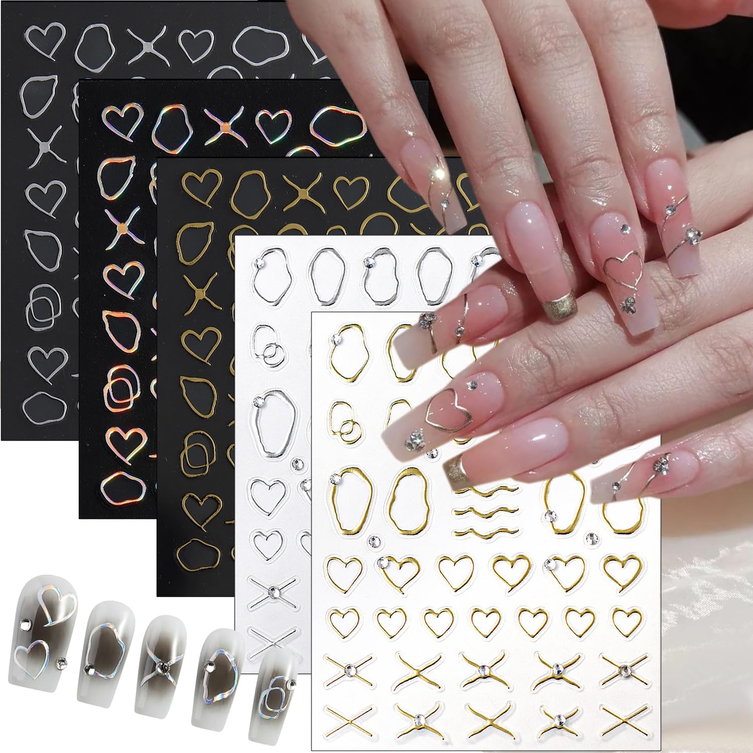 Simple French Nails Art Stickers Heart Lines Nail Decals 3D Self Adhesive Hollow Geometric Frame Nail Stickers with Diamond Design Stripe Nail Supplies Bronzing French Decoration for Women 5Pcs