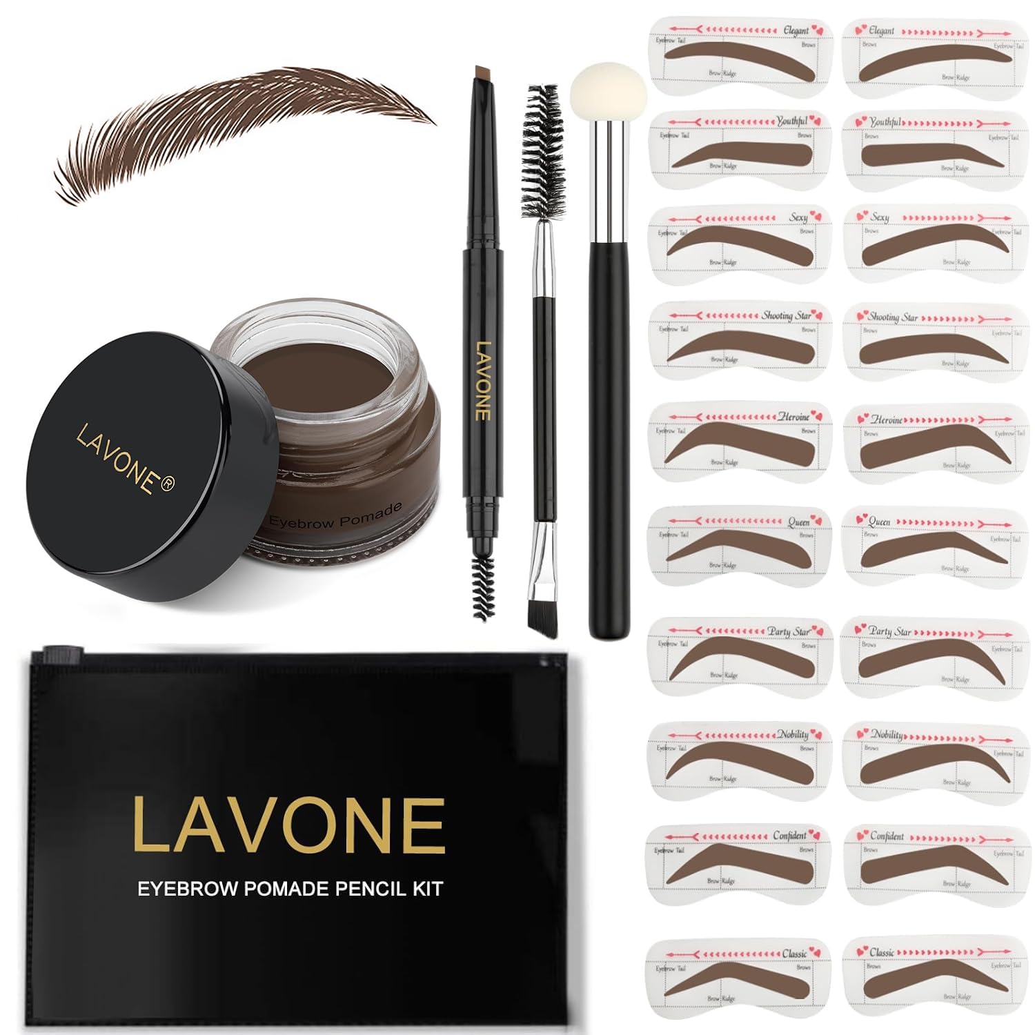 - [What’s in the eyebrow kit]: LAVONE makeup eyebrow kit includes eyebrow powder(Dark Brunette), brow pencil (dark brown), 20 eyebrow stencils (10 different shapes), a sponge applicator, a dual precision brush and a zipper pouch for on the go.