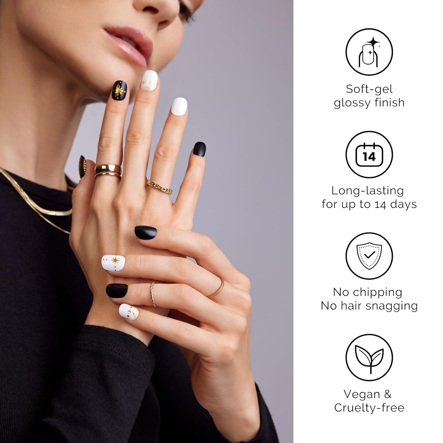 Semi Cured Gel Nail Strips - NAILOG 34 Pcs Gel Nail Stickers Buy 2 Get 1 UV Light | Long Lasting Nail Wraps with Glossy Gel Finish Black, Astral Glyphs