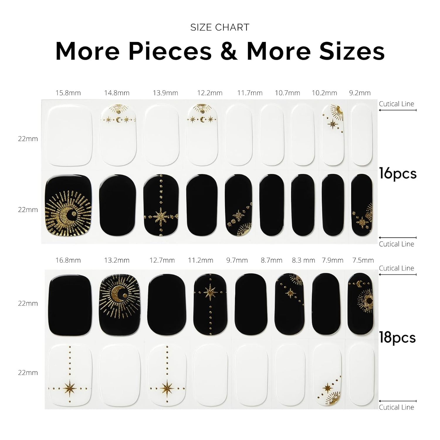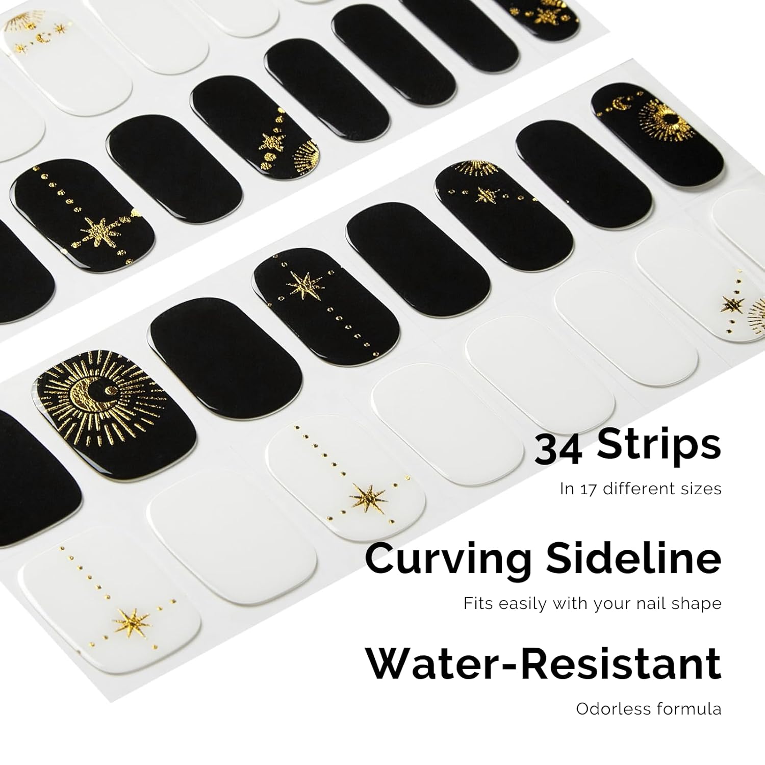 - ă34 PCS NAIL STRIPSăMore Quantity & Sizes than Ever! - With 17 different sizes of our nail art stickers, you can easily find the right size to match your nails. - New curved side line fits even better with your nail shape for seamless adhesion.